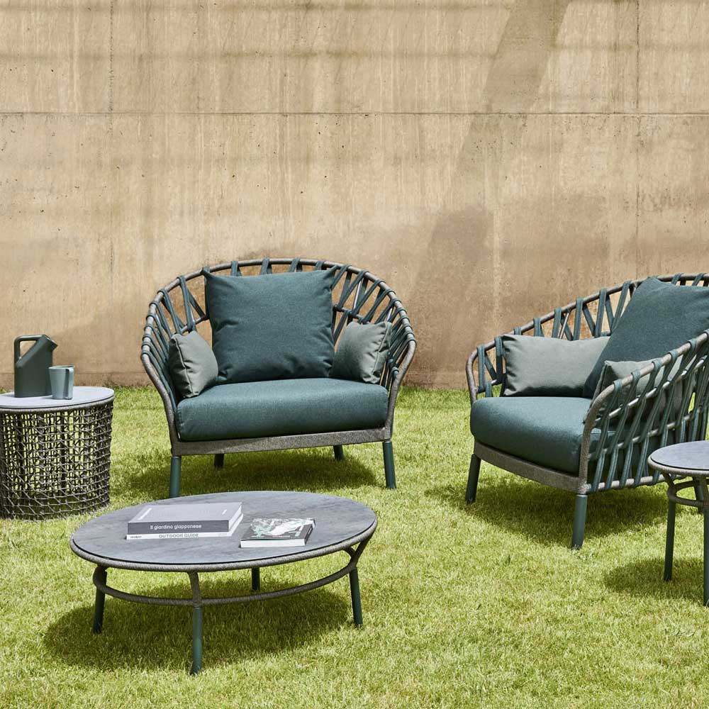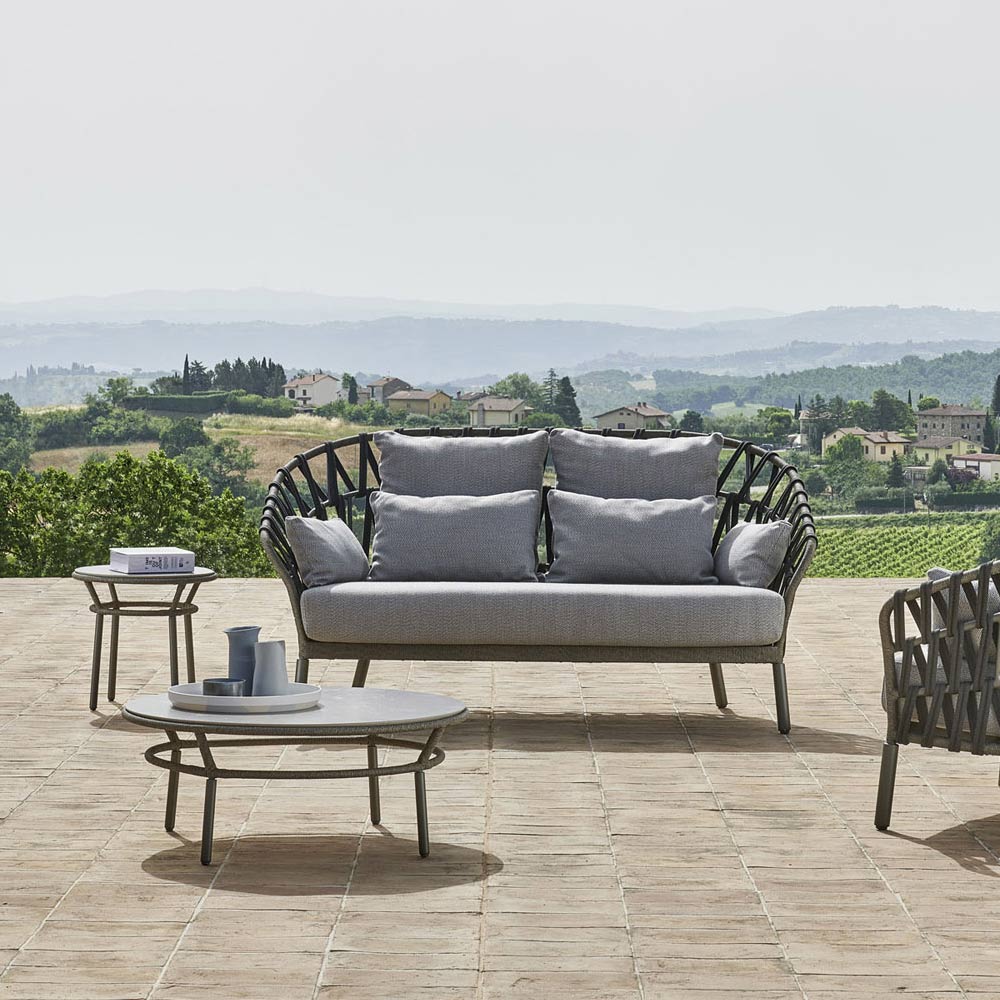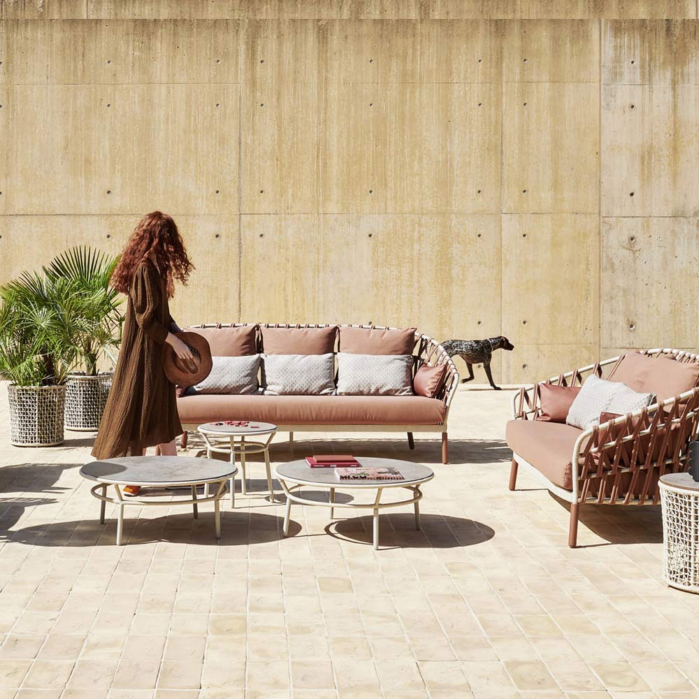 Round outdoor coffee table made in Italy with epoxy powder coated aluminum structure, synthetic fiber rope weaving and hpl or bush-hammered ceramic top. Thanks to its linear, clean and functional design, this coffee table is perfect for furnishing outdoor environments such as terraces, swimming pools and gardens, while also finding its place in the various indoor living areas.