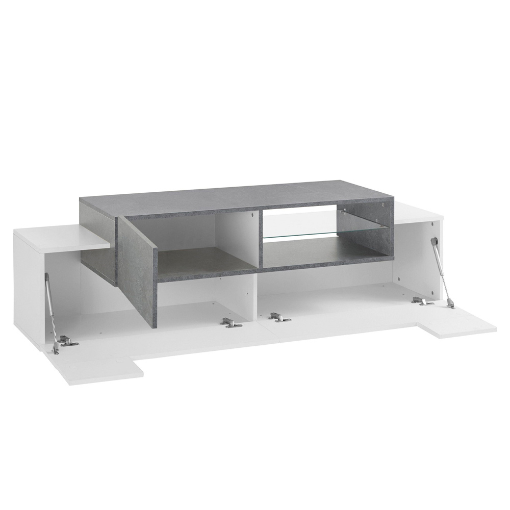 low TV cabinet for the living room consists of 2 side flap doors made of glossy white lacquered wood and 1 hinged door in melamine wood available in two finishes with a central open compartment with a glass shelf. The design thus created presents a suggestive and contemporary contrast to be placed