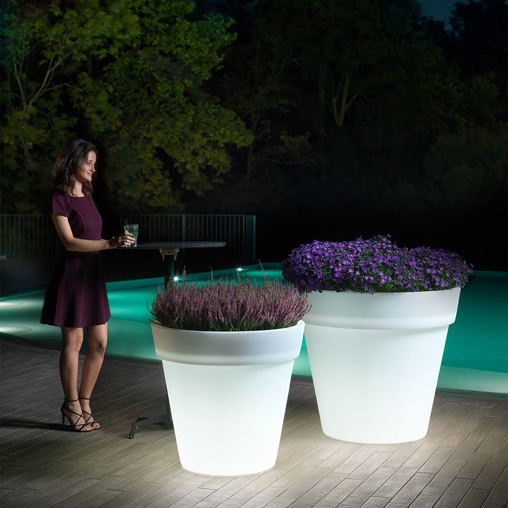 The luminous outdoor vase in pearl polyethylene made in Italy is available in different sizes to furnish the outdoor living space with personality and Ā take advantage of its elegant functionality . The structure also includes a water drainage kit which makes this vase highly practical without neglecting the final result, a radiant atmosphere of elegant and suggestive light. The integrated LED light makes this outdoor vase a contemporary furnishing accessory, with soft lines to reflect an idea of classic but incredibly elegant style.