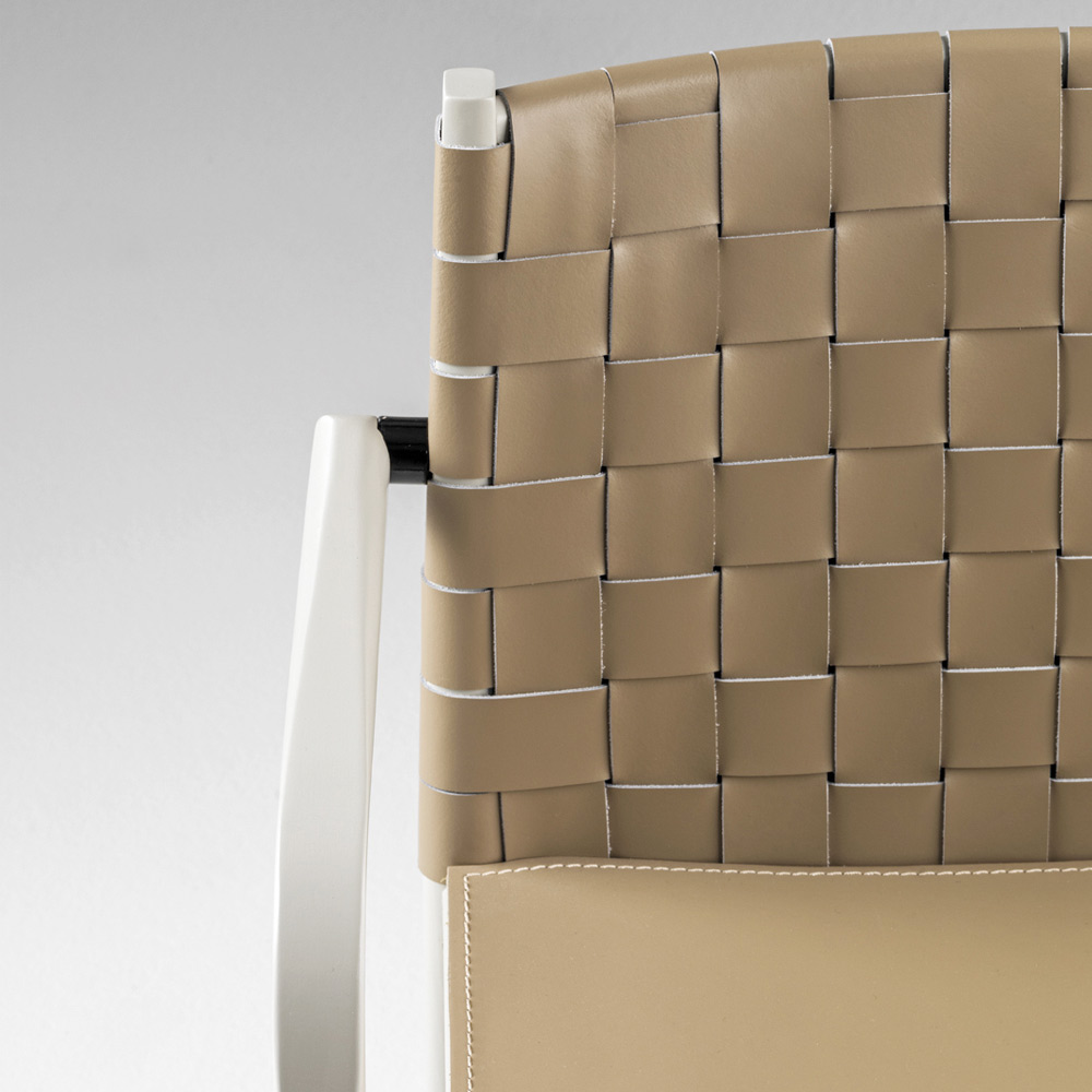 Modern chair with armrests made in Italy with beige lacquered beech wood structure and leather back and seat. A design that takes its cue from traditional styles revisited in a contemporary key to create a complement that reconciles a functional side and a purely decorative side capable of characterizing and making the furniture of any modern environment unique. What enriches the aesthetics is the peculiarity of the back in woven leather which increases the originality of the product and which, thanks to the range of colors available, responds to every style need, managing to create a unique harmony between all the accessories. present.
