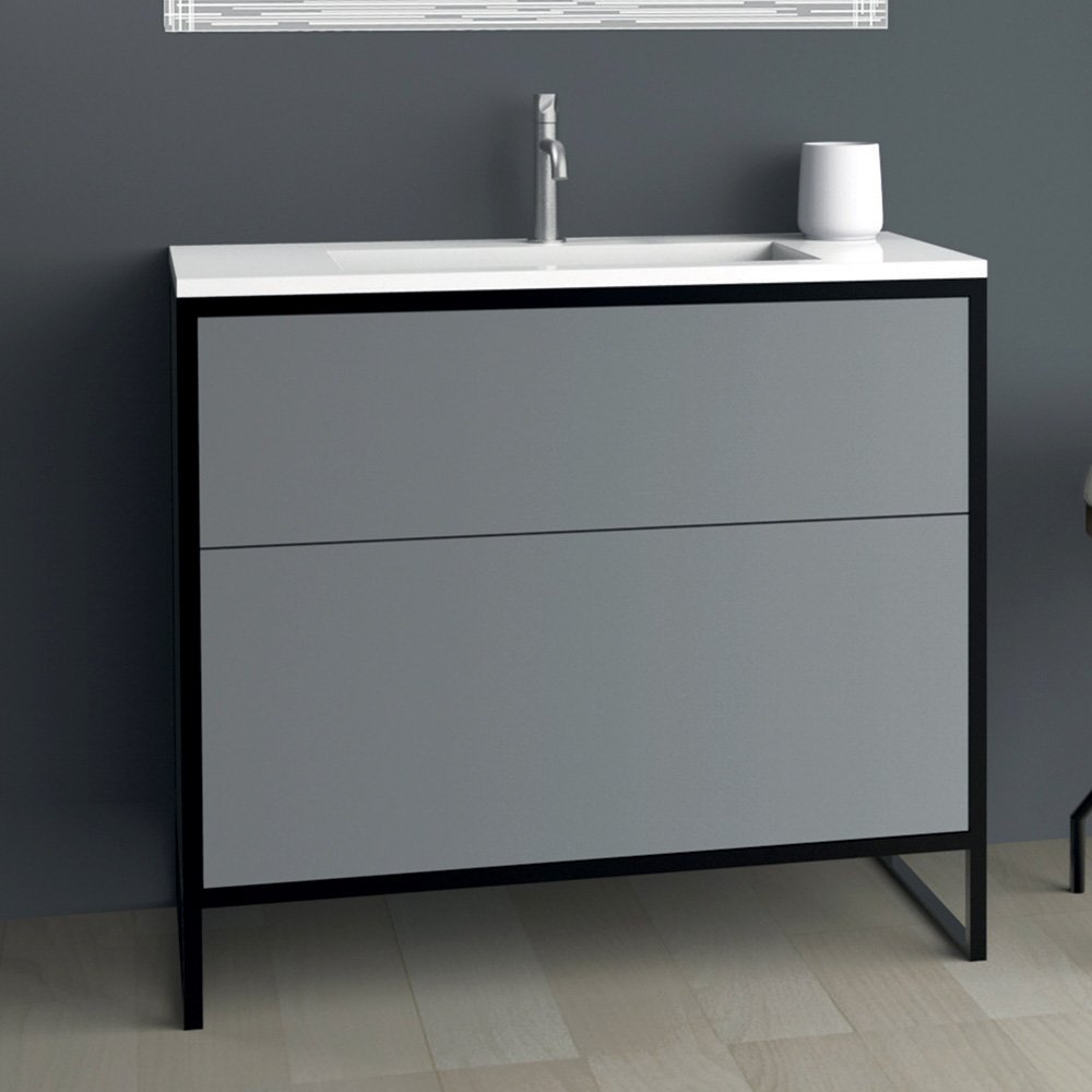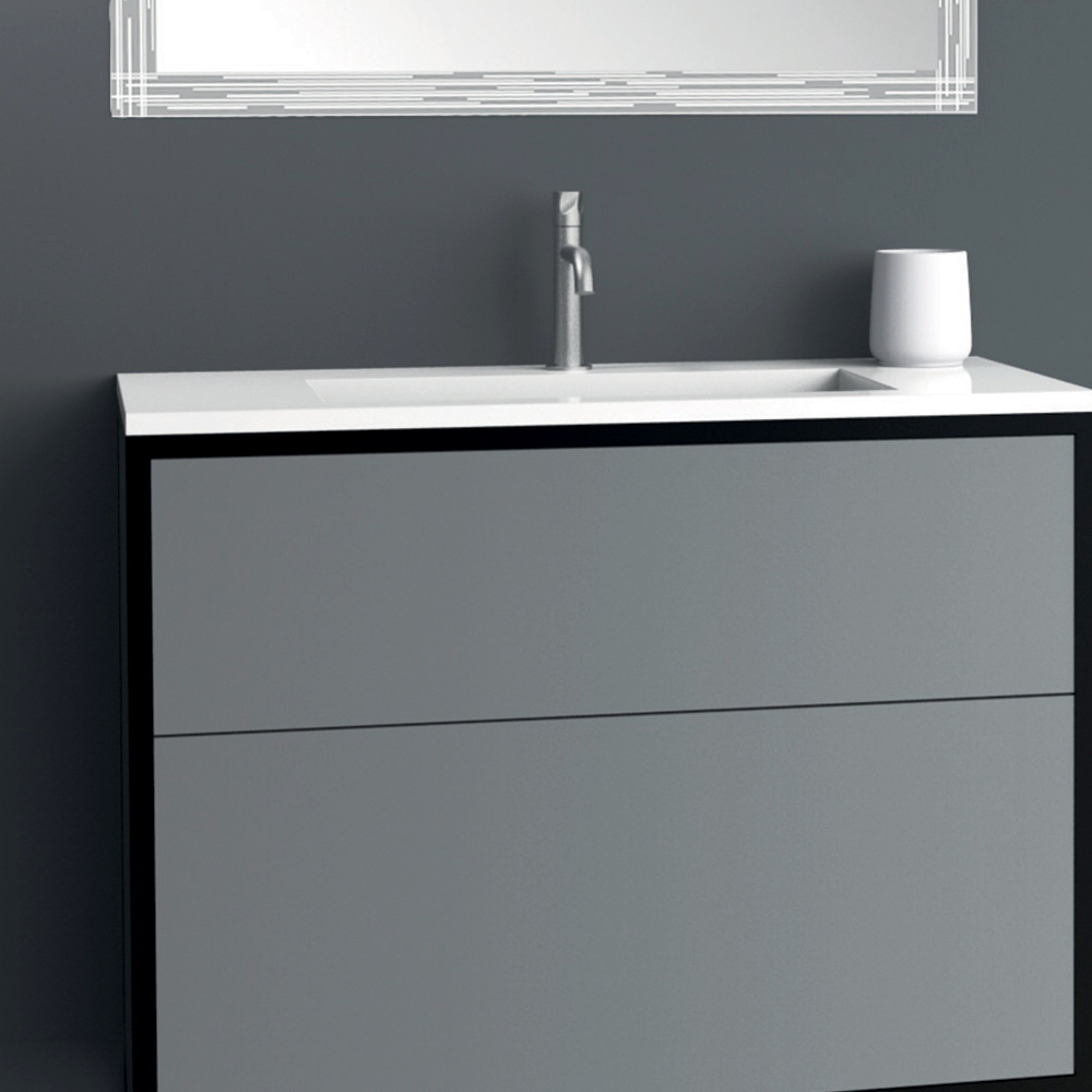 This line of bathroom furniture is characterized by a structure made with a thin matt black painted metal profile, front doors in matt traffic gray lacquered mdf wood RAL 7042 and integrated top in glossy white marble resin, creating a harmonious combination of full and empty spaces with style industrial.