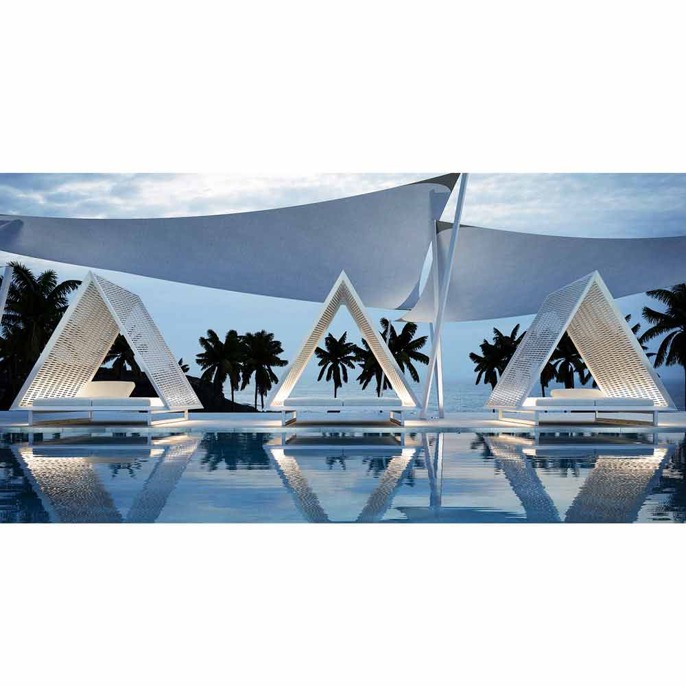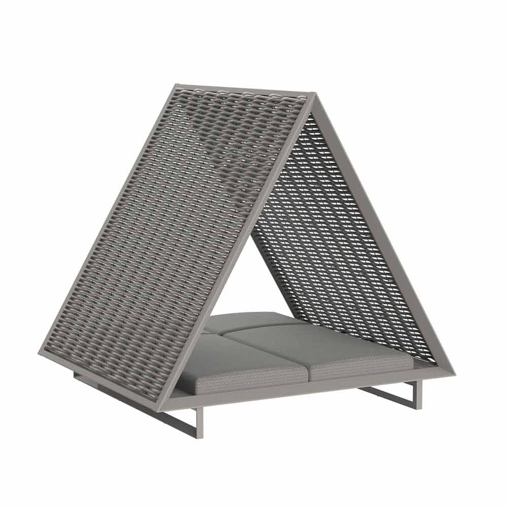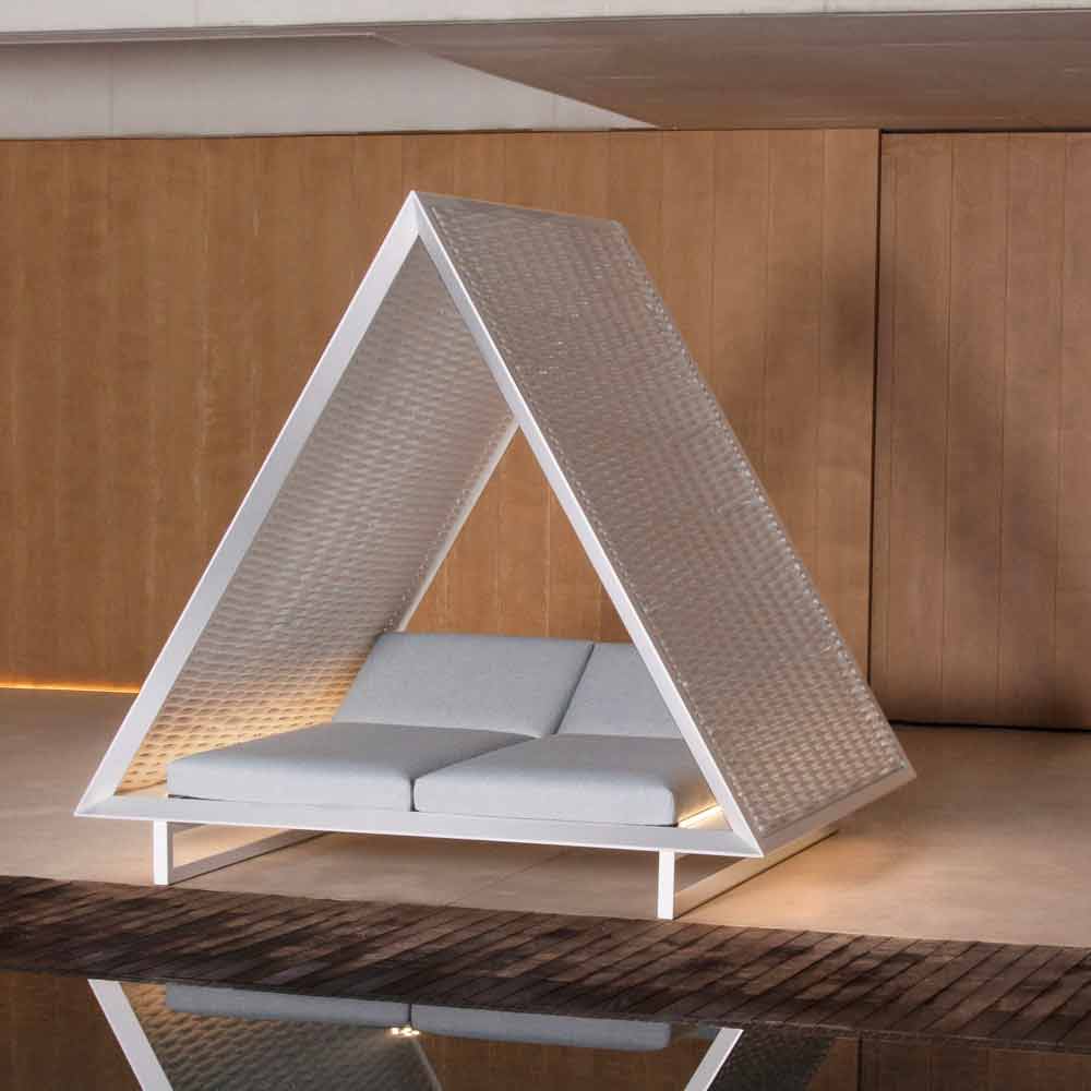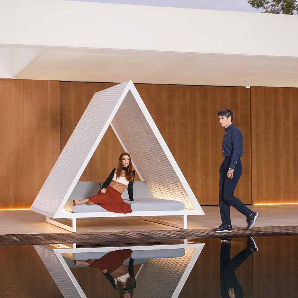 This outdoor daybed is inspired by an elegant design and boundless luxury, with the idea of creating a refuge with a traditional pyramid-shaped architecture.