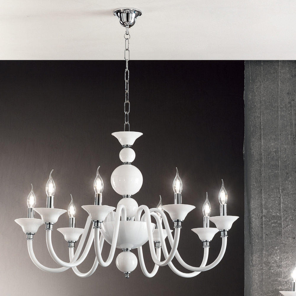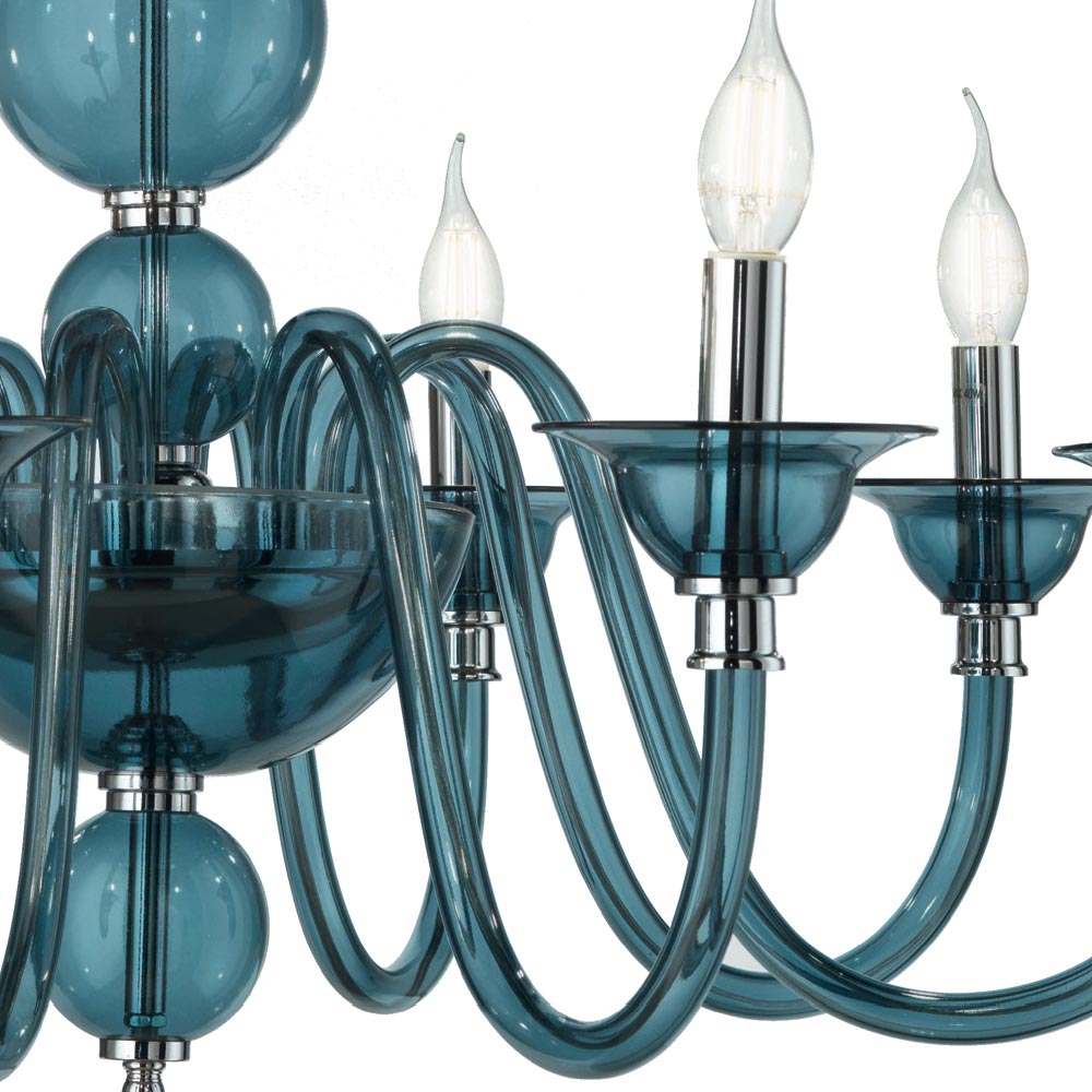 Ideal for those who want scenographic lighting with the style of times gone by, its classic and luxurious design is made up of spheres positioned one above the other for the light body, which allow a glimpse of the chrome metal core, and from 8 arched arms, completely made of hand-crafted glass and available in different elegant shades, in order to fit completely into any place and satisfy different needs.