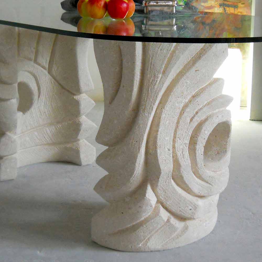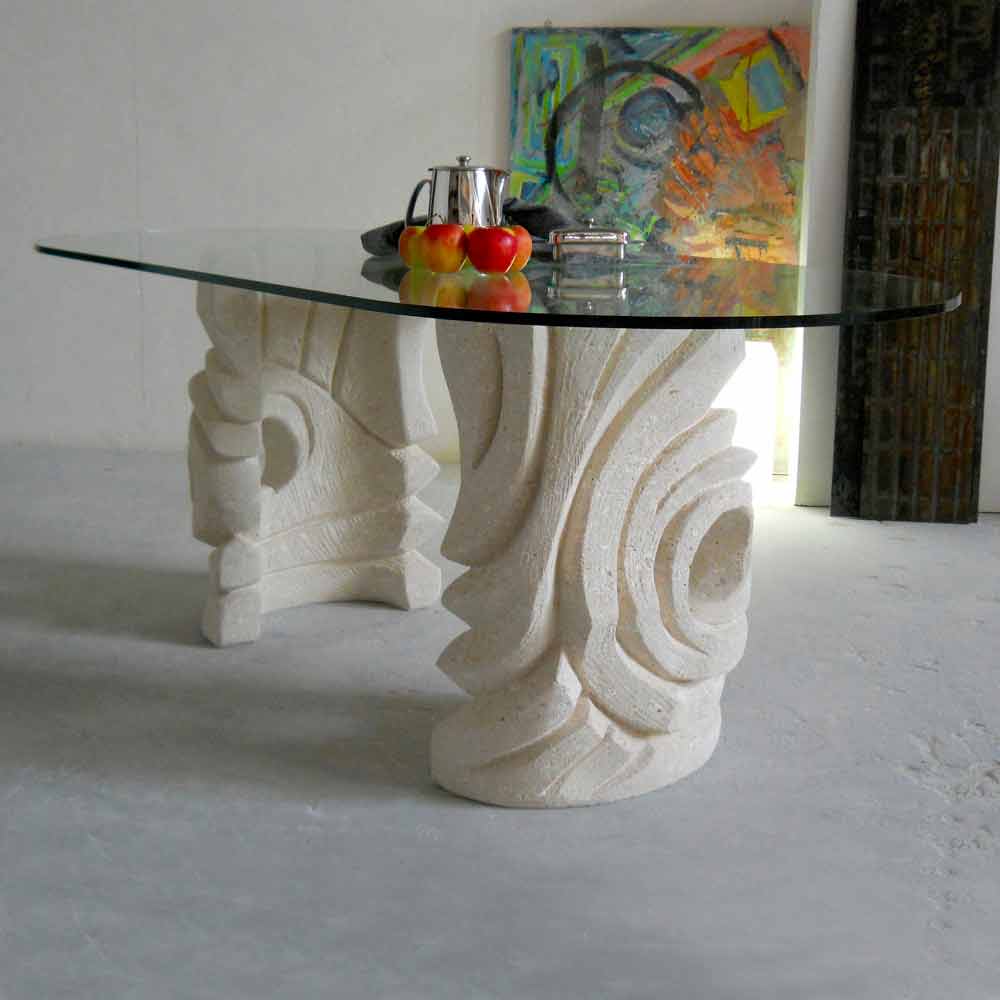 The dining table Erinni is entirely made in Italy. Its base is made of Vicenza natural stone and it has been hand-carved from the original stone block. The table top is made of float crystal (15 mm thickness) layd on the base.