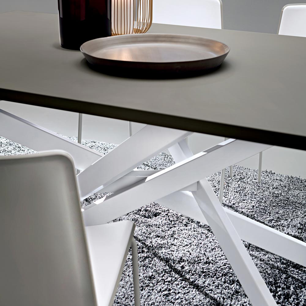 Dining table made in Italy with top in fenix and base in metal painted with white epoxy powders. A piece of furniture with a simple and versatile soul whose design is enriched and made unique by the particular shape of the legs which, thanks to the unusual woven shape, give the table its true modern and exclusive personality . The elceptive nuance of the base also makes every color combination perfect, thus making it ideal for the most varied modern furnishing situations in which it fits perfectly, giving the environment an innovative and refined touch . On a visual level, its peculiarity is the stratified fenix top which, through the use of innovative resins , offers a resistant, pleasant to the touch and extremely opaque surface , elements which, in addition to increasing the functional side of the table, underline and complete the 'aesthetics.