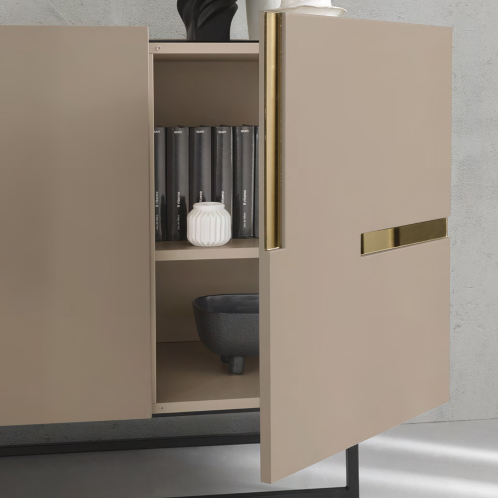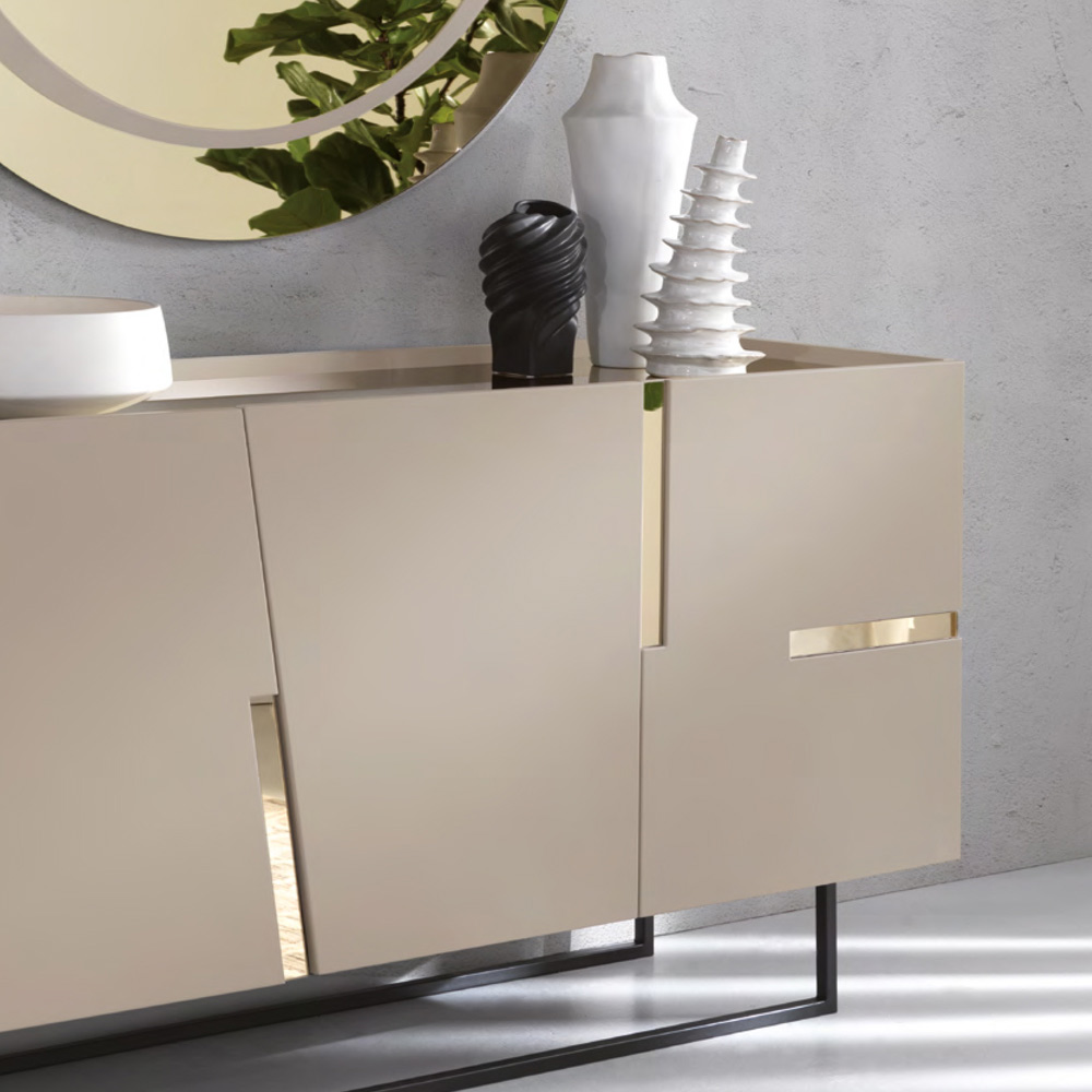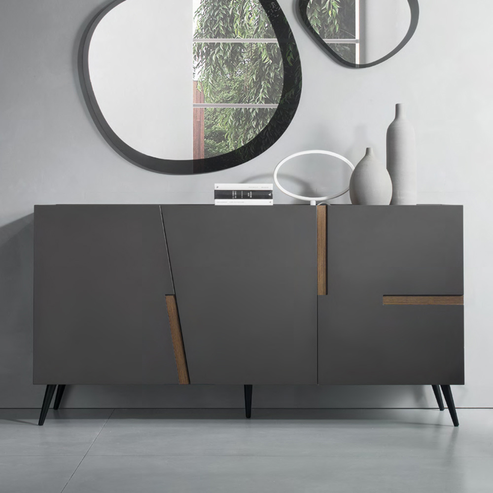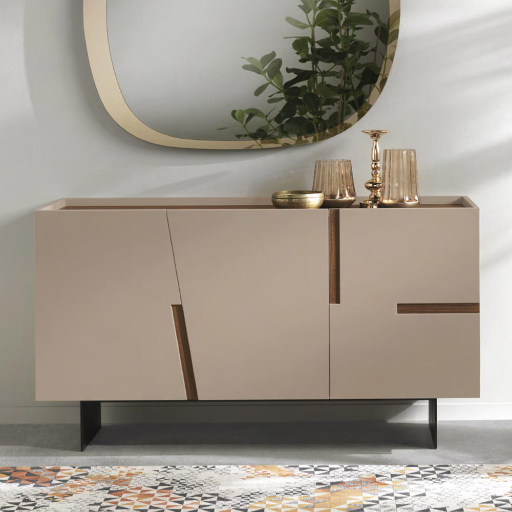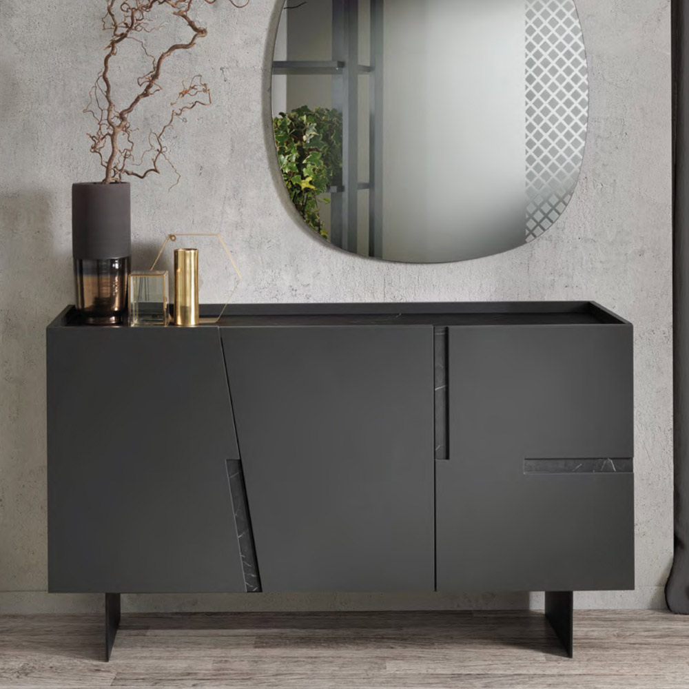 Modern sideboard with structure in melamine , 3 doors in lacquered mdf with a practical shelf inside each, enriched by elegant inserts in laminate or mirror and base or feet in black painted metal . A piece of furniture in the name of functionality and innovative design , characterized by rigid and essential shapes and embellished by refined contrasts of materials and finishes. An eclectic and versatile style designed for different uses and different areas of the house in which it furnishes in an exclusive and refined way, conquering the role of protagonist thanks to its strong modern personality and its imposing character .