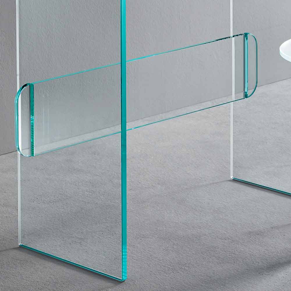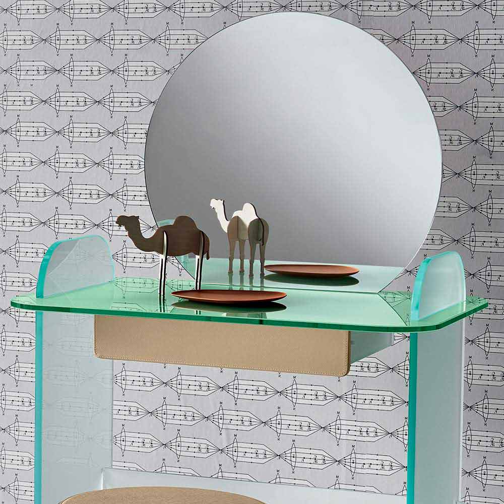 Symbol of femininity and refinement, this dressing table has a structure entirely made of glass available in three finishes and a pull-out drawer available in matt white wood or covered with beige leather.