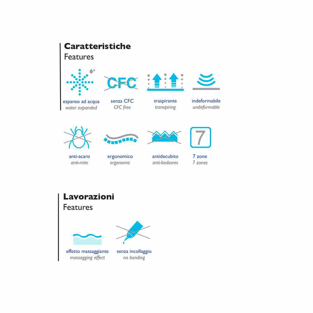 The best transpiration is also guaranteed by the particular profile and by the holes that bind the Memory to the "Natura" foam layer that supports the body weight correctly and effectively, also shaped in the lower part to facilitate the use of this product on nets mechanized.