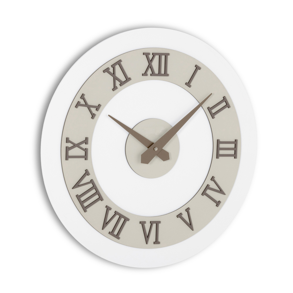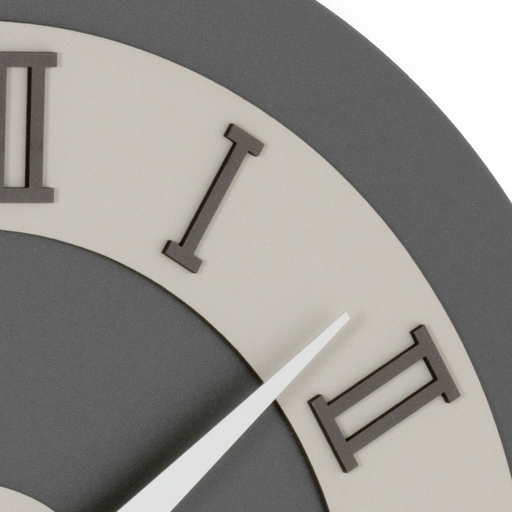 Wall clock made with MDF backing laminated with polypropylene films with different textures that create new contrasts with unique and designer shades. The embossed applications on the dial are made of layered pressed linen composed of environmentally sustainable natural raw materials with a very durable and pleasant surface to the touch.Ā