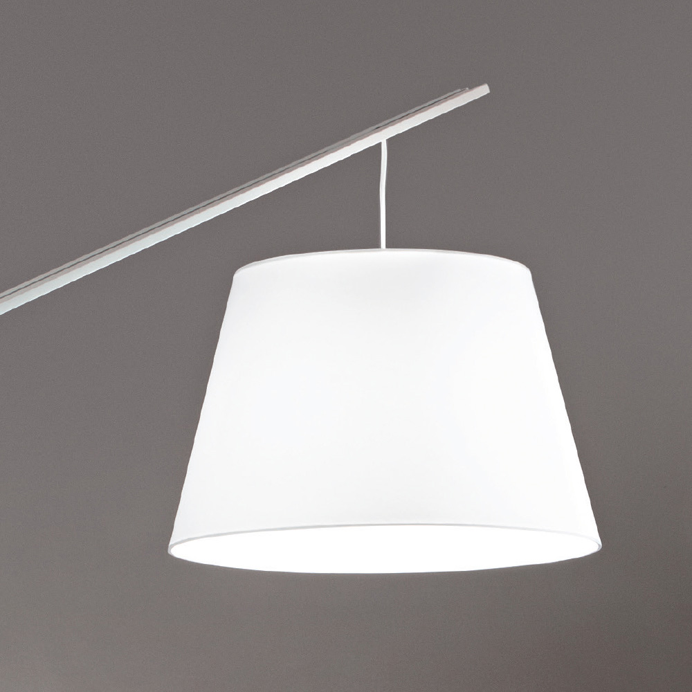 Modern metal floor lamp with PVC lampshade covered in fabric.