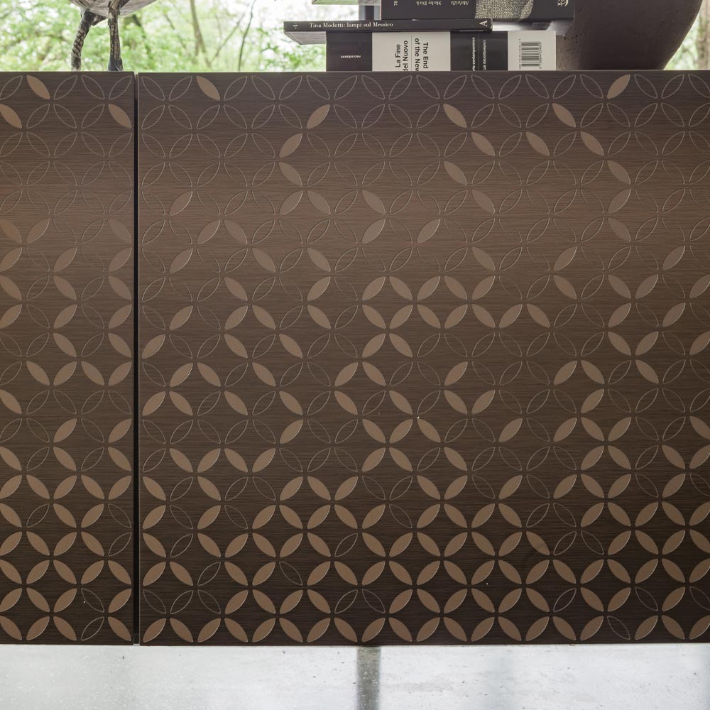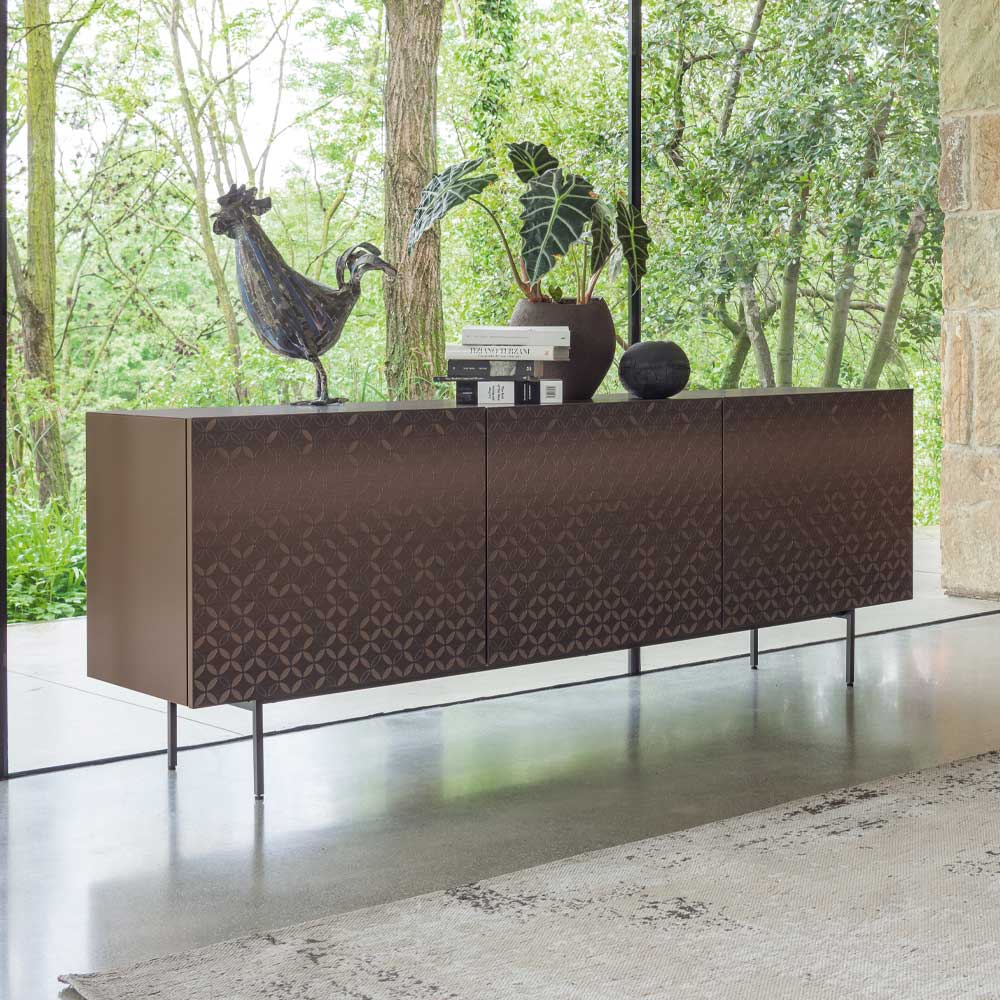 Made in Italy. Fusion of elegance and functionality that enhances the beauty of modern environments. Defined by the decoration of its doors, which enrich the furniture with quality details similar to delicate embroidery. Each compartment of the sideboard is equipped with two spacious internal shelves, ensuring practical functionality. The effect of elegance is accentuated by the insert that characterizes the doors, a detail that adds a touch of refinement and modernity to the design.