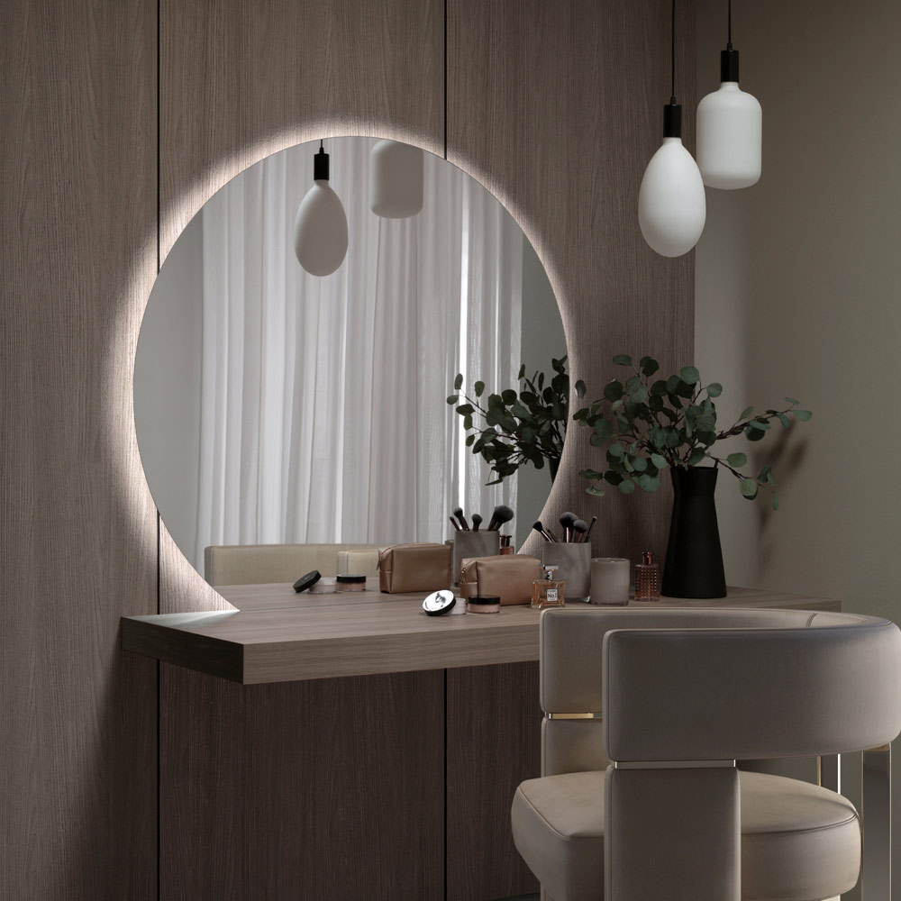 This circular mirror is a design masterpiece that embodies elegance and modernity. The backlighting that follows its profile gives an ethereal glow and a soft light that enhances every environment, creating an intimate and refined atmosphere. The round shape of the mirror, a timeless style choice, reflects and amplifies the natural light and beauty of the surrounding space. Perfect for the entrance, the bathroom or as a focal point in a living room, this backlit mirror is not just a reflective element, but a real furnishing object that combines form and function, beauty and brightness, for a result of pure style and atmosphere.