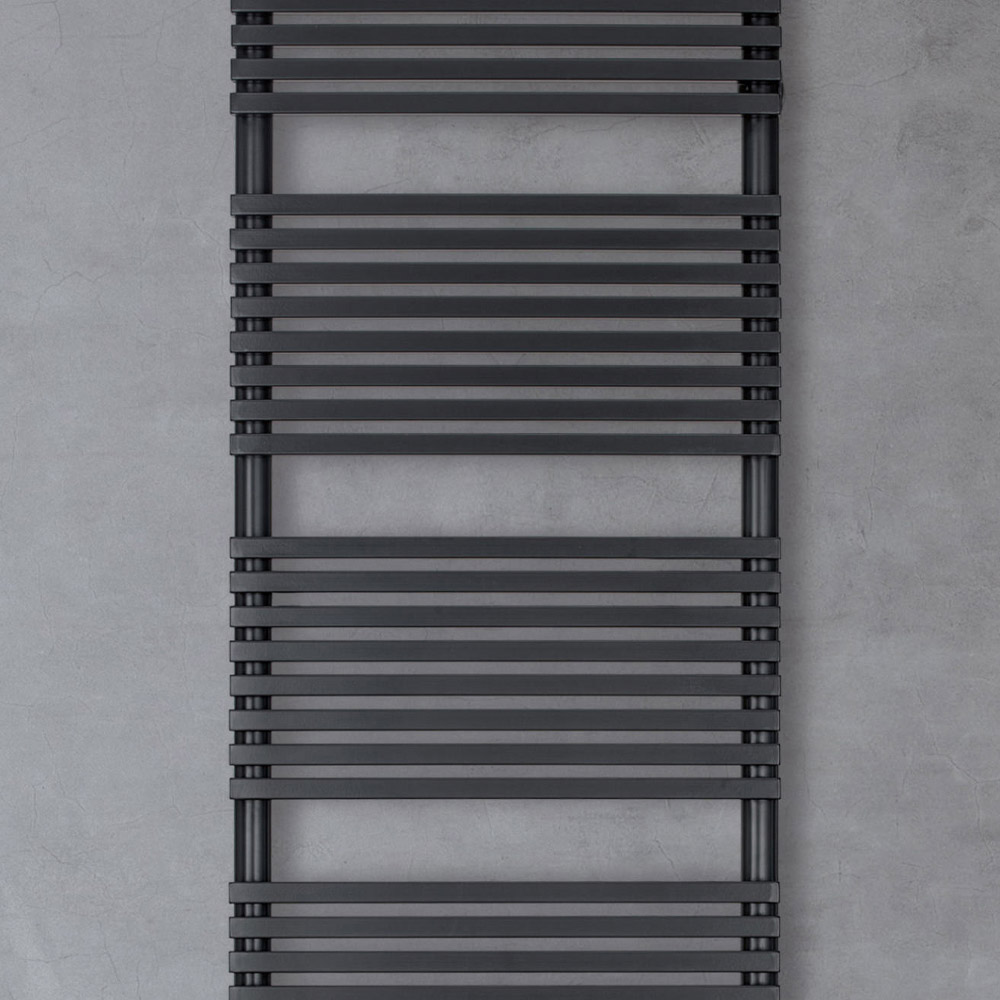Hybrid heated towel rail in carbon steel with jet black finish consisting of a series of horizontal elements with a 2 cm square section welded onto vertical manifolds with a diameter of 3.5 cm. Entirely made in Italy with wall fixing kit, vent valve and blind plug included .
