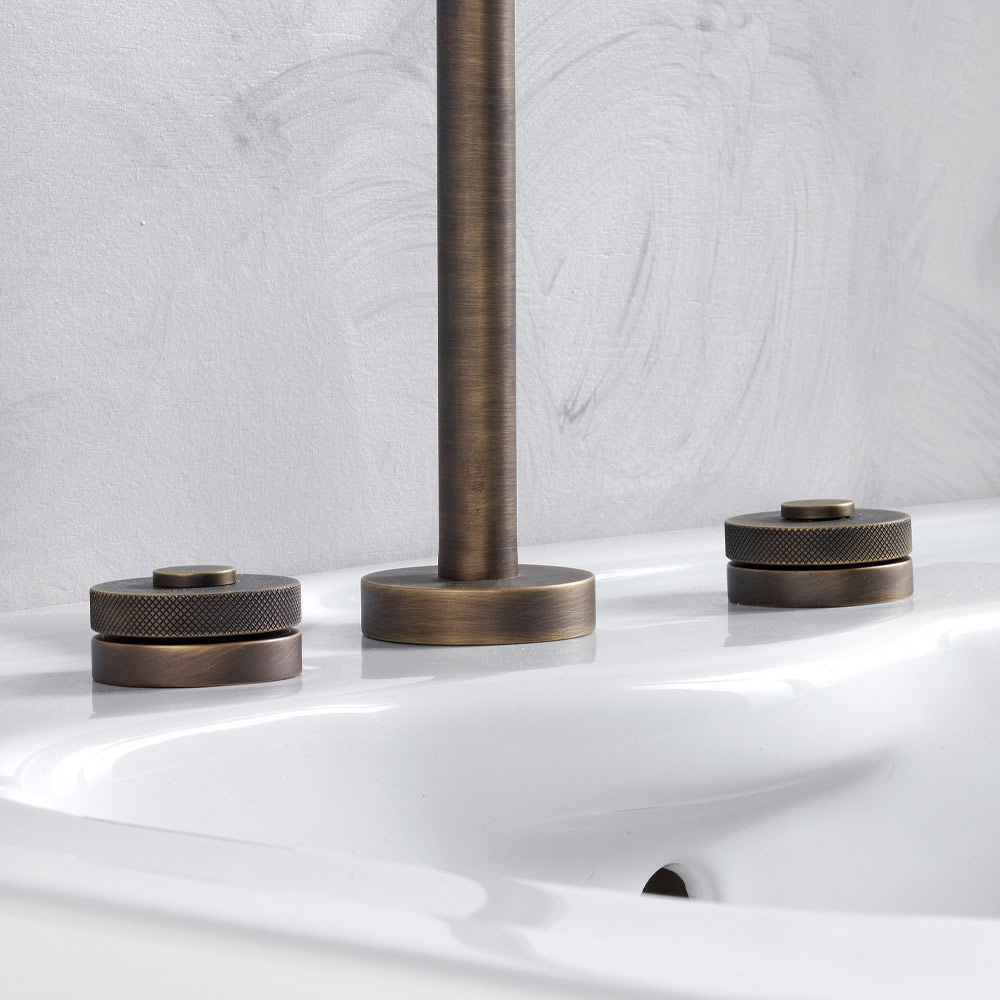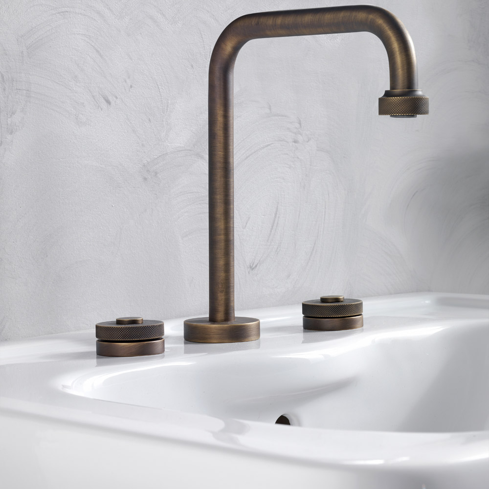 Battery 3-hole washbasin with drain entirely handcrafted by expert artisans in the industry in heavy brass, cast in molds that respect the craft systems of the past and protected with a thick layer of finish available in various colors.
