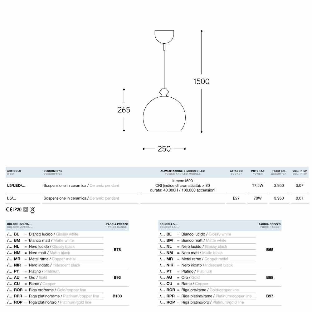 Modern ceramic pendant light I Lustri 5 -2 90° outputs canopy, made in Italy