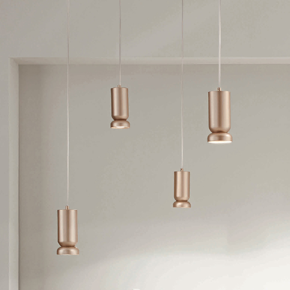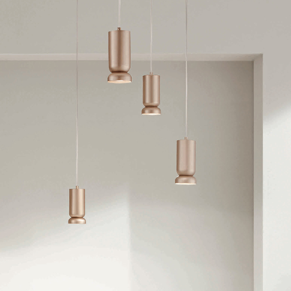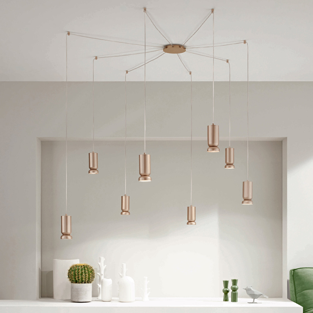 powder-coated aluminum with gold finish. All cables are adjustable, both in width in the ceiling and in length with the lights.