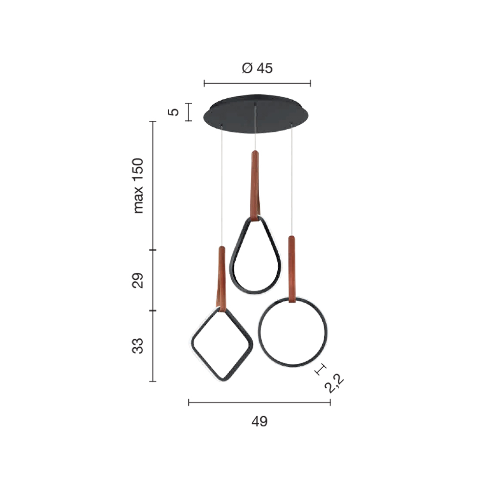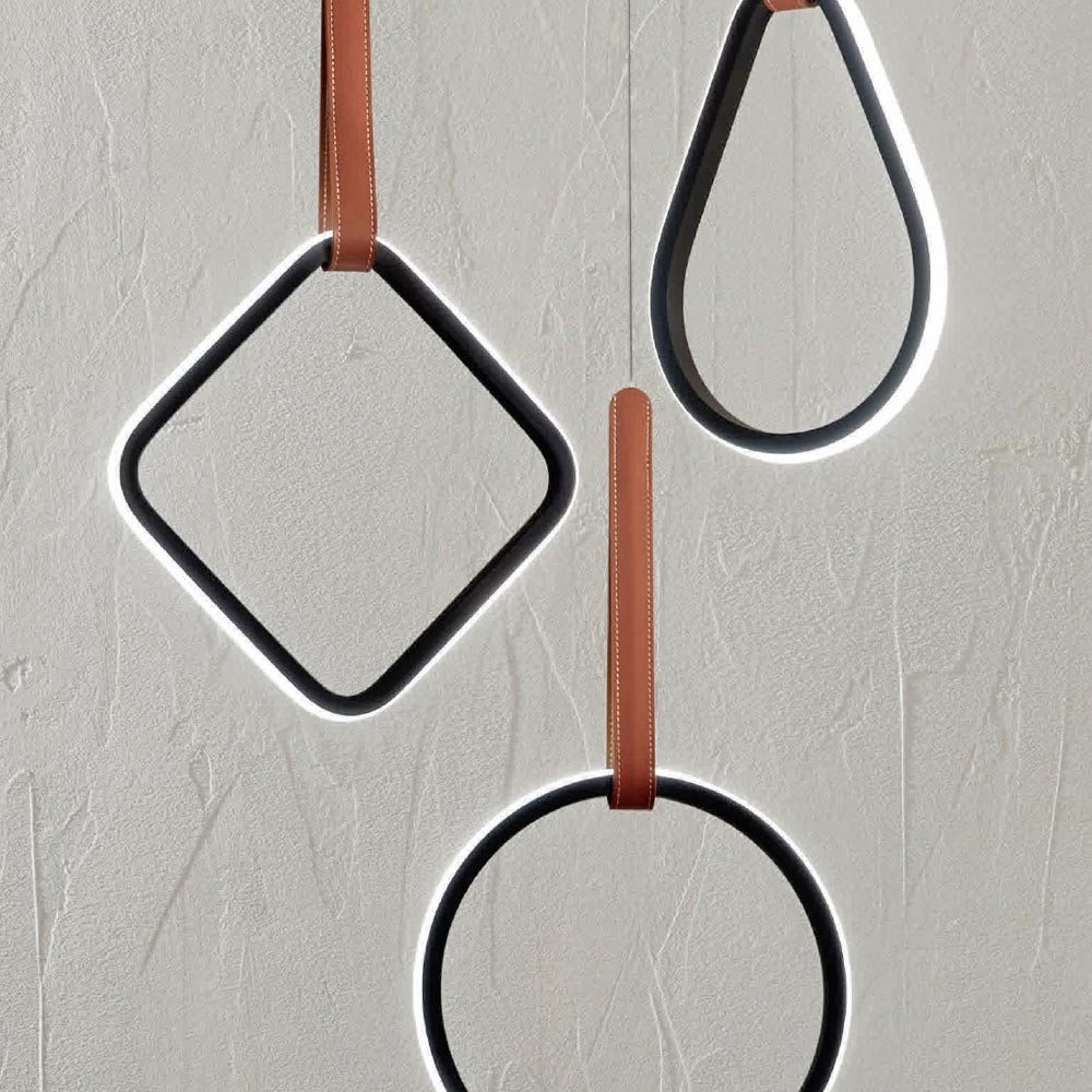 Chandelier entirely produced in Italy made of black painted metal and element in tan eco-leather with cables adjustable in length and dimmable LED lights in different geometric shapes.