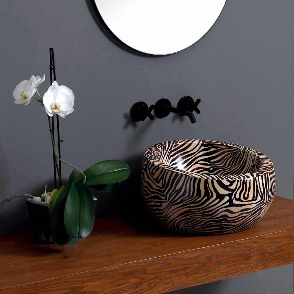 Elisa is an orange zebra finish ceramic countertop washbasin with light and decisive lines.