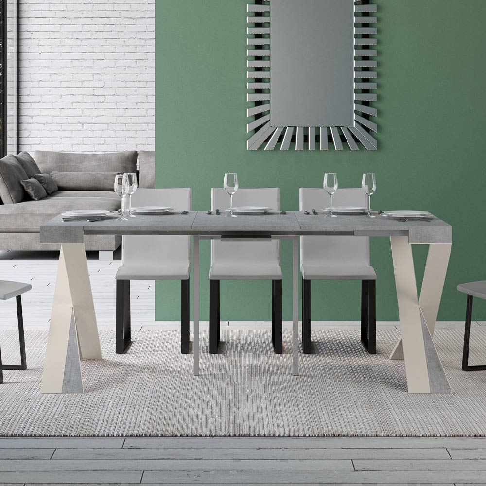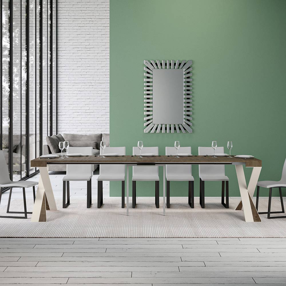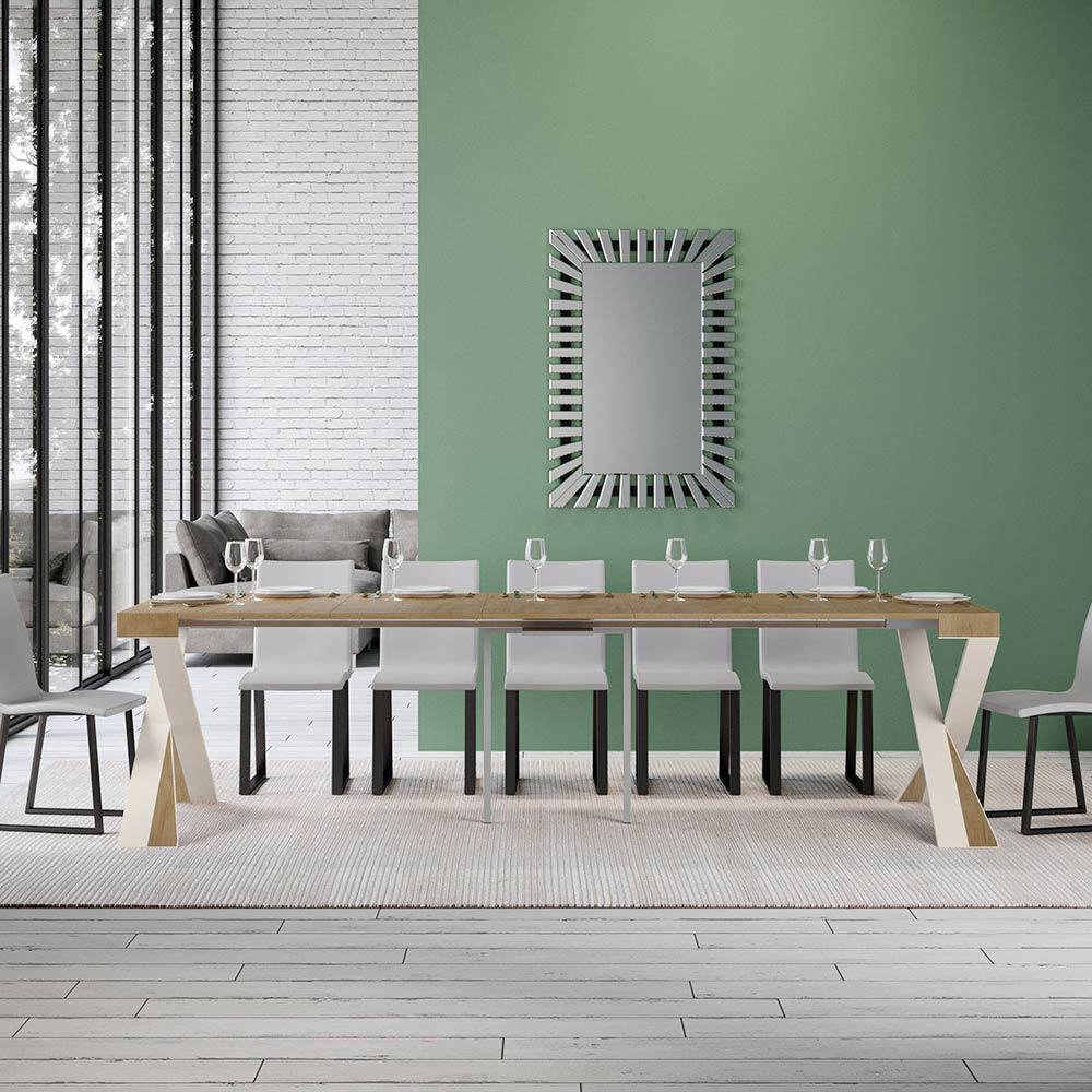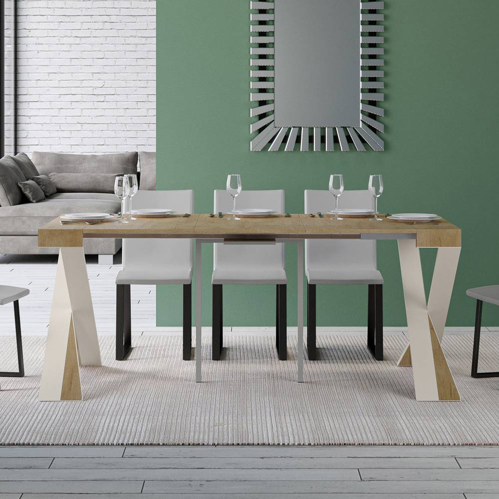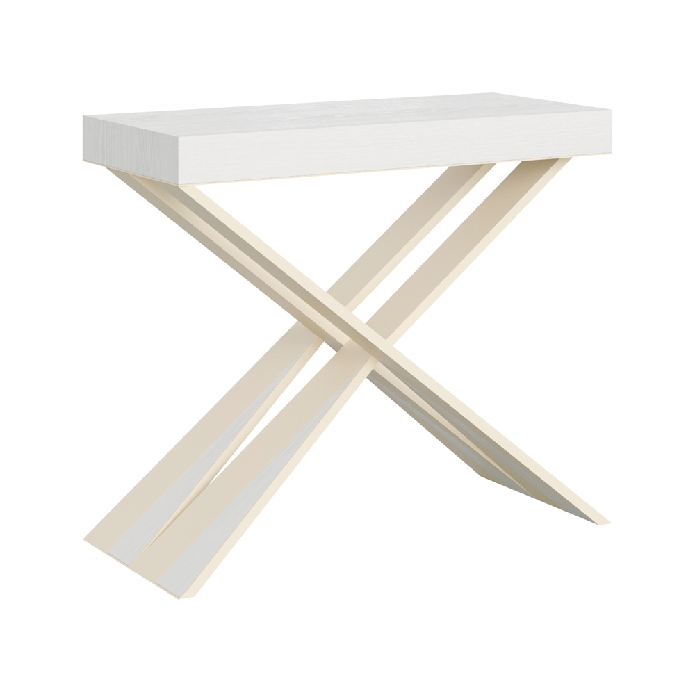 This extendable console table embodies elegance and functionality in an eye-catching design. É features a modern silhouette with a X base that not only provides solid support but also adds a touch of sophisticated originality. The top in furnished woodĆØ a tribute to the quality of Made in Italy, prized for its durability and ability to withstand the passage of time.