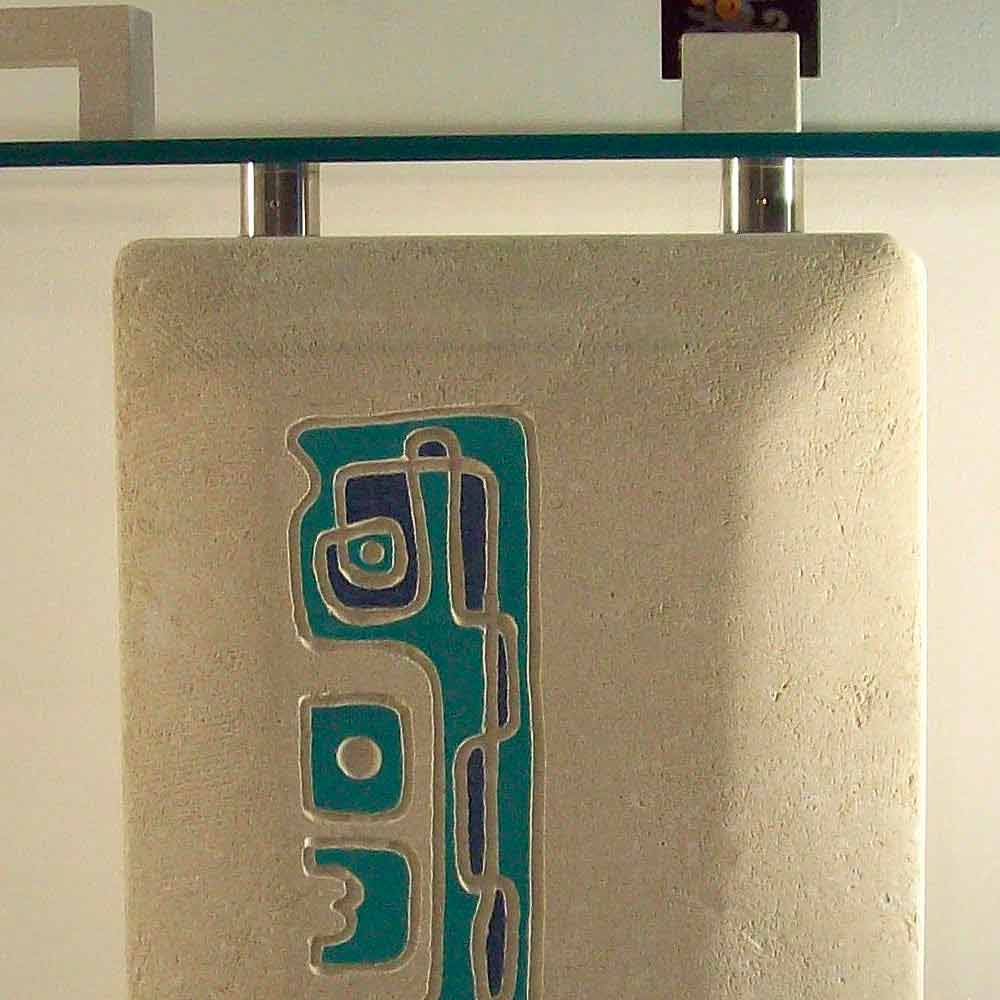 The console table Soter is entirely made in Italy. Its base is made of Vicenza natural stone and it has been hand-carved from the original stone block. The table top is made of float crystal (15 mm thickness), which has been secured to the base with 2 extractable steel flanges.