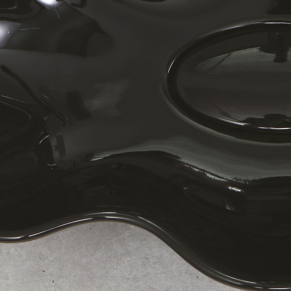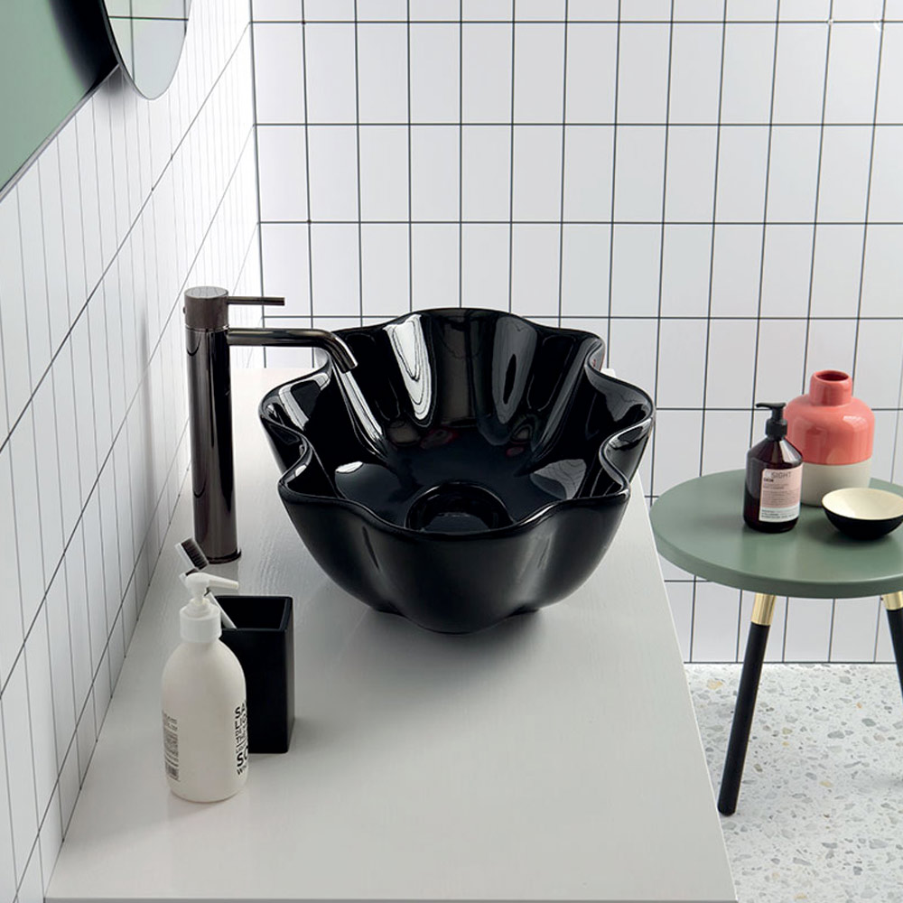 Shaped countertop washbasin for the bathroom area in colored ceramic with a glossy finish made in Italy through an artisanal production . An original and captivating design that comes from the desire to propose furnishing solutions far from the classic series products. The result is a washbasin with an exclusive aesthetic that draws attention to itself thanks to its imposing modern personality and the particular shape reminiscent of a shell.