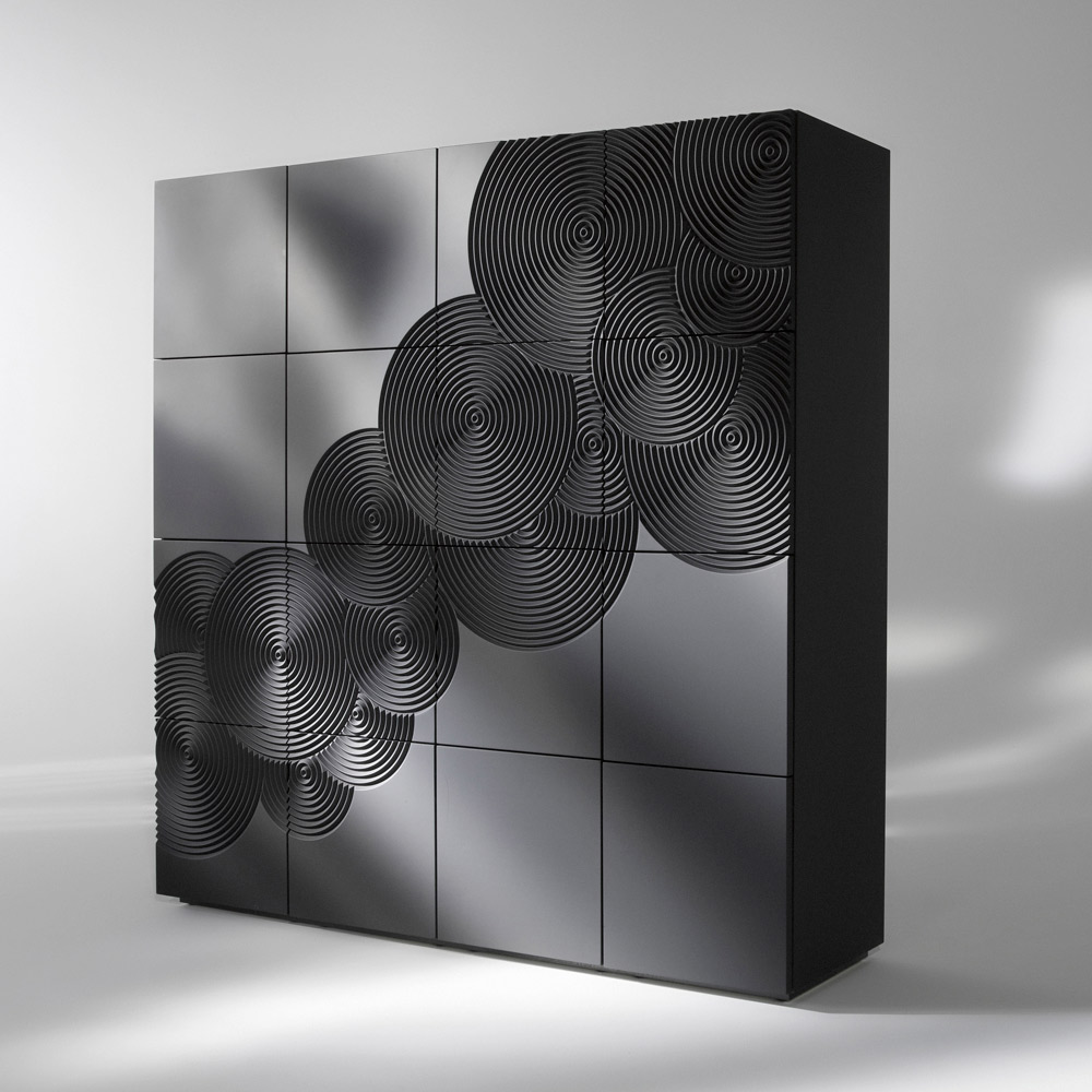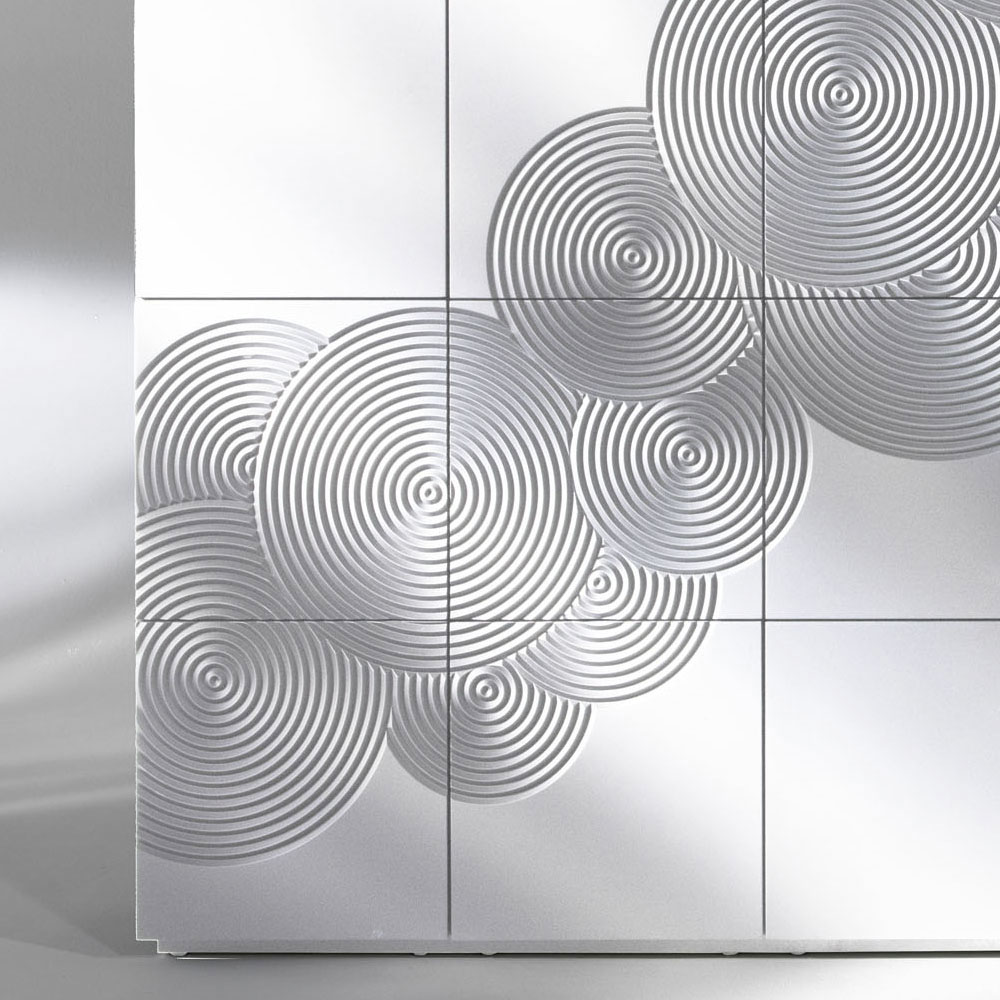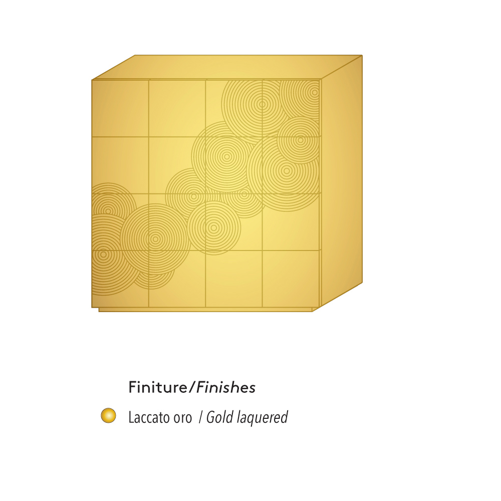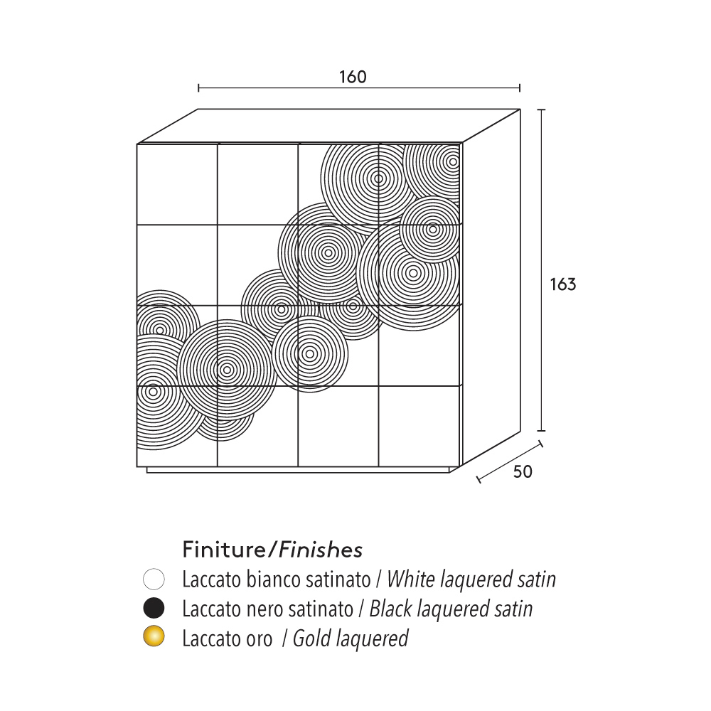 Sideboard with 8 decorated doors with 4 internal shelves in lacquered MDF, made in Italy.