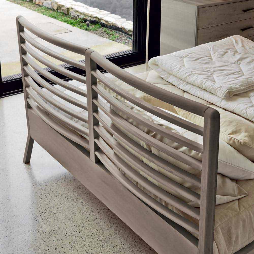 In this solution the most harmonious bed offers a padded headboard, embellished with seams that trace vertical lines. Essential and elegant, it is made of oil-finished solid walnut, to be inserted in the most refined furnishing contexts.