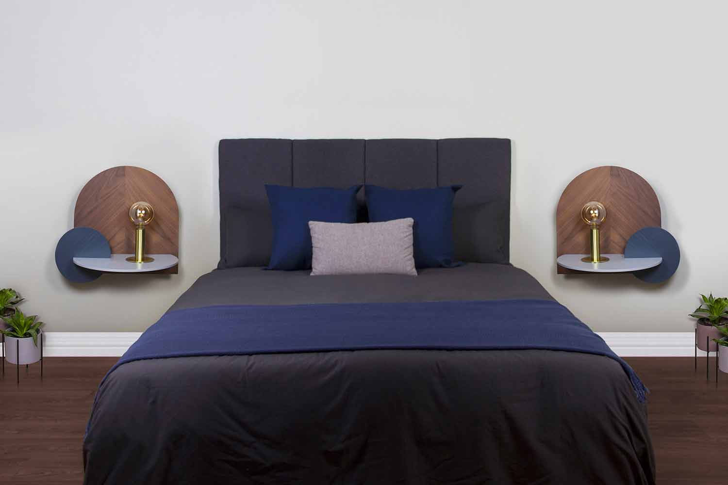 This modular bedside table represents an innovative and original idea able to conquer every attention inside the room thanks to its unique style and the combination of materials and finishes that give elegance and an extremely modern design . Its structure is made up of 3 plywood panels, one in walnut wood finish and two in blue and gray painted ash finish . The panel that acts as a real support surface is fixed to the wall and the 2 modular panels are mounted on it, which can be positioned in 8 different configurations, thus obtaining a product that can be customized according to one's needs and spaces. The structure also has a cable hole positioned behind the front panel, allowing them to be hidden and making the bedside table even more functional and practical. Between the vertical panels and the wall there is a 9 cm compartment that can be used to store and organize books and magazines or any other object, optimizing the available space to the best.