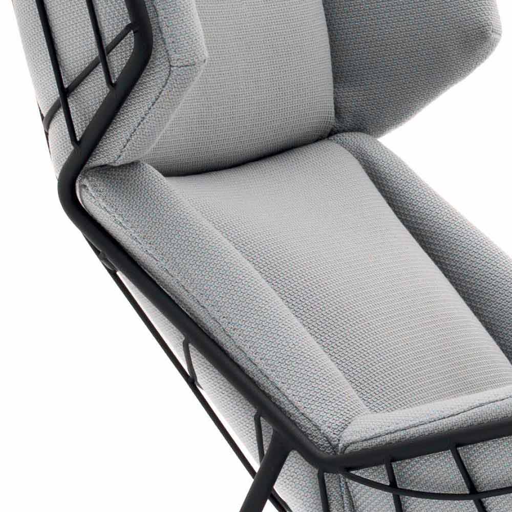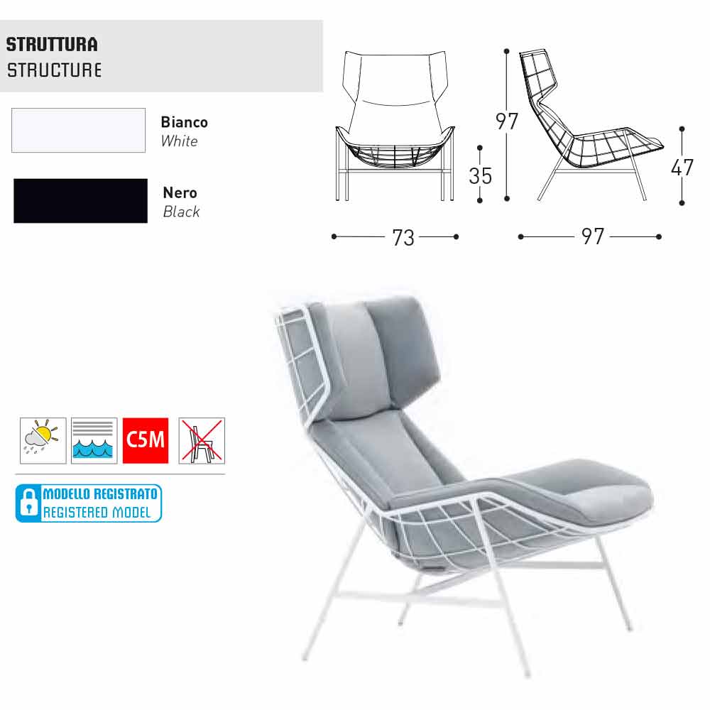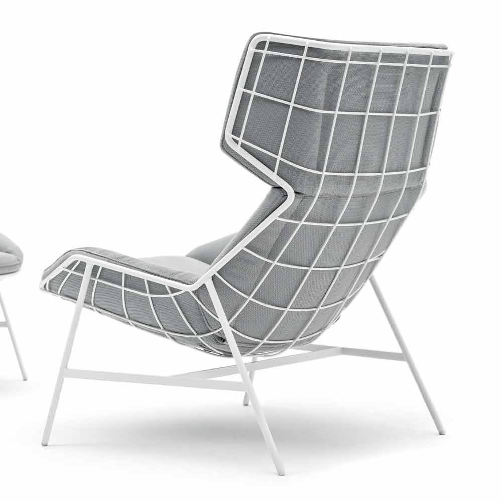 Summer Set is an enchanting bergere relax garden armchair, characterized by a supporting structure in powder-coated steel with a choice of white or black colors; seat and back cushion covered in fabric and padded with Dryfeel rubbers.