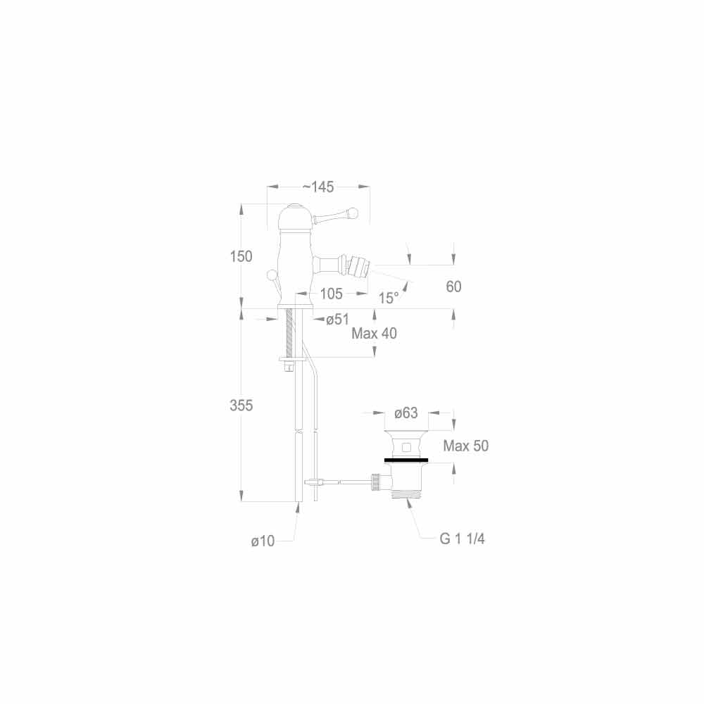 Classic design countertop bidet mixer in chrome finish brass 150 mm high and 105 mm center distance, with drain and pull-rod.