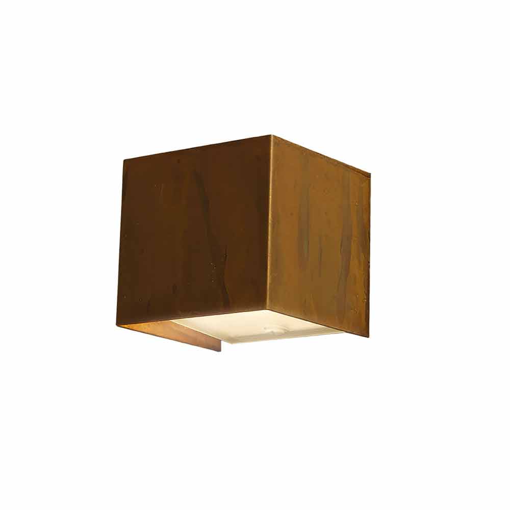 Wall lamp with oxidized brass structure. Available in two sizes in the round or square shape. Tempered glass diffuser for direct and indirect light emission.
