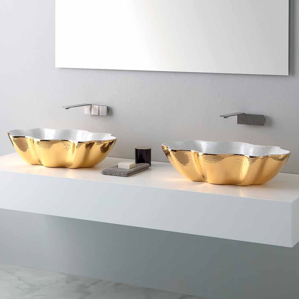 Cubo is a countertop washbasin made in Italy in extraluxury ceramic in two colors of gold and white.