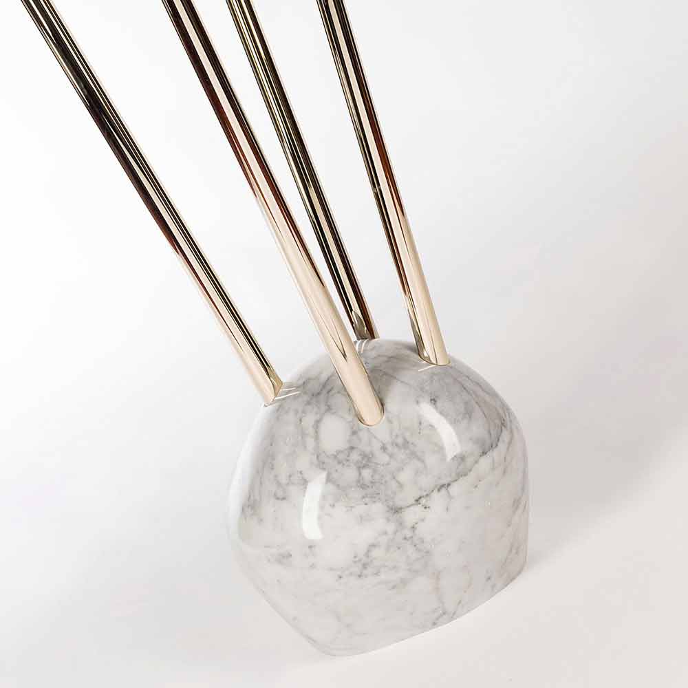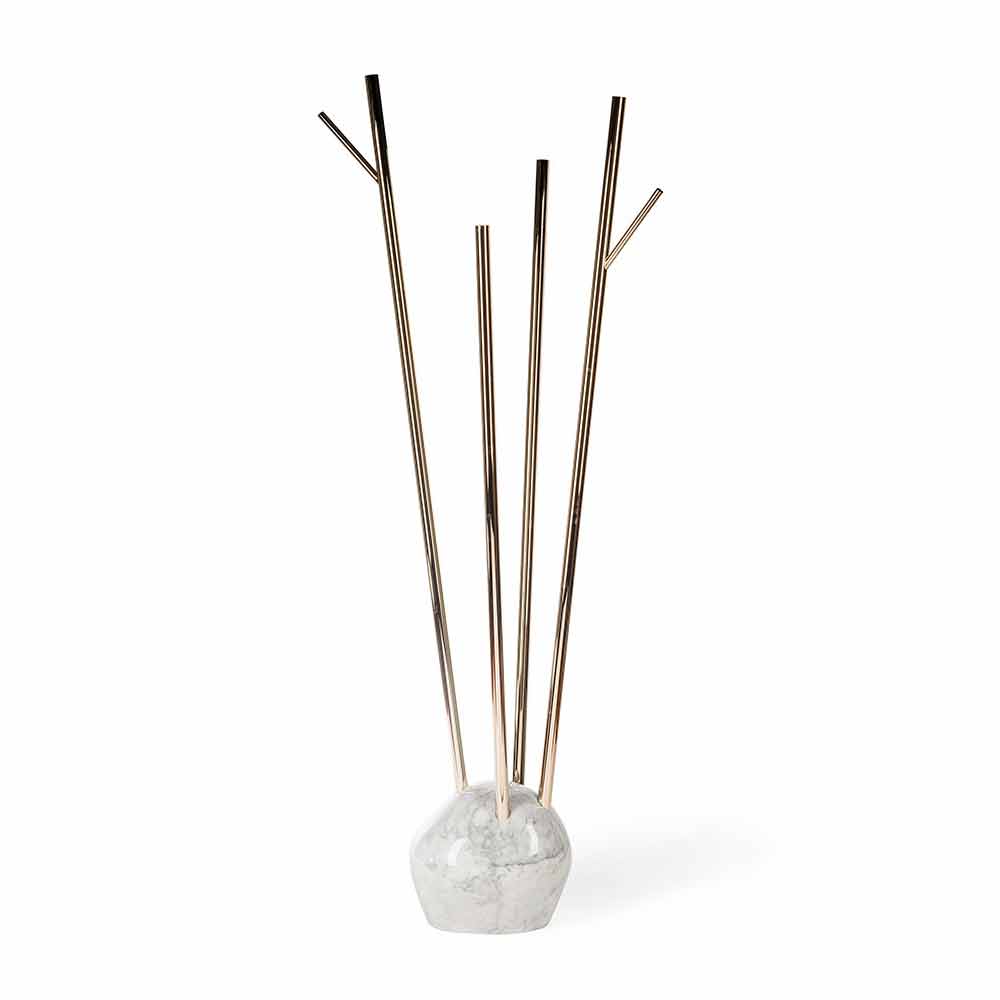 Coat hanger with base in white Carrara marble and galvanized metal stems in 24 kt shiny gold finish.