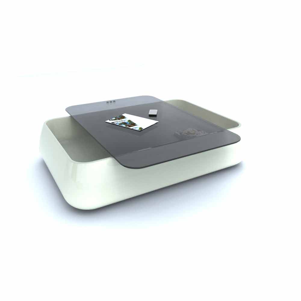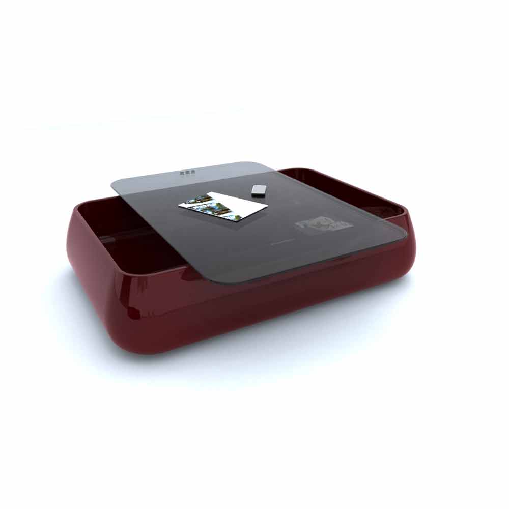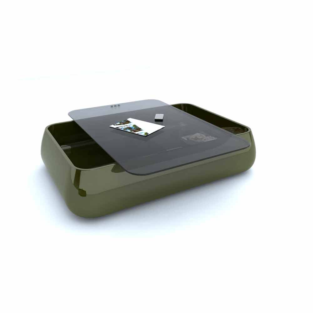 Coffee table with rounded and ergonomic shapes. It has a rounded shape, from which the name Bomber takes its name, which ironizes precisely on its shapes, and tapered towards the top. It is made up of a structural part in Solid Surface; also having a containing function, through a secondary shelf inside it, and a top in another material: wood, marble or glass, or even in cork, where the latter placed by interlocking, can be comfortably grasped and removed from the base, to place magazines, objects and so on inside the complement.