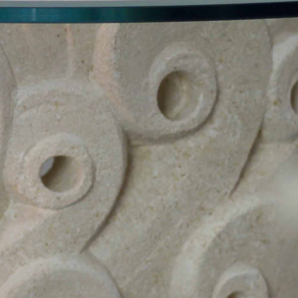 The coffee table Lindos is entirely made in Italy. Its base is made of Vicenza natural stone and it has been hand-carved from the original stone block. The table top is made of float crystal (12 mm thickness), layd on the base.
