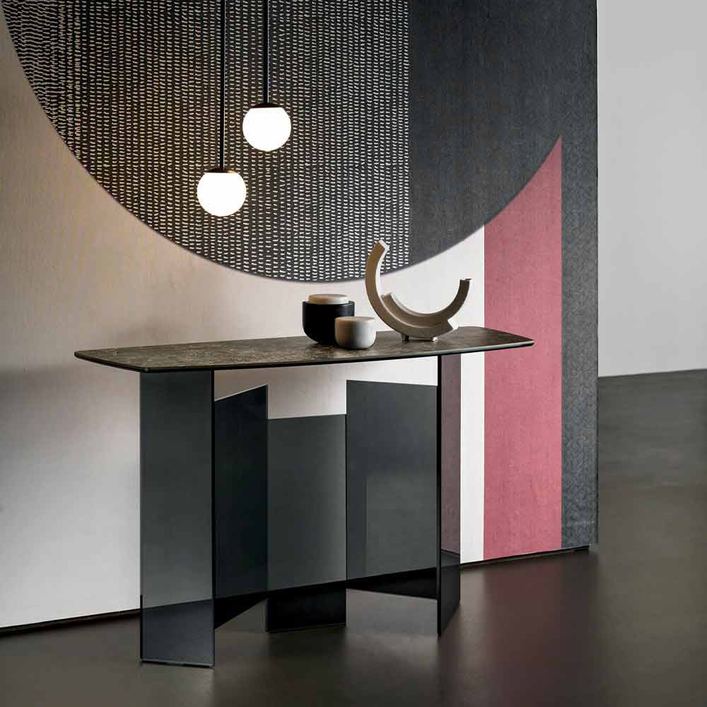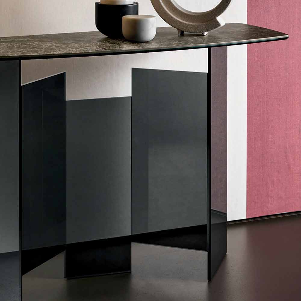 Modern livingroom consolle with Emperador or Noir Desir ceramic top and glass base, realized by hand in Italy.