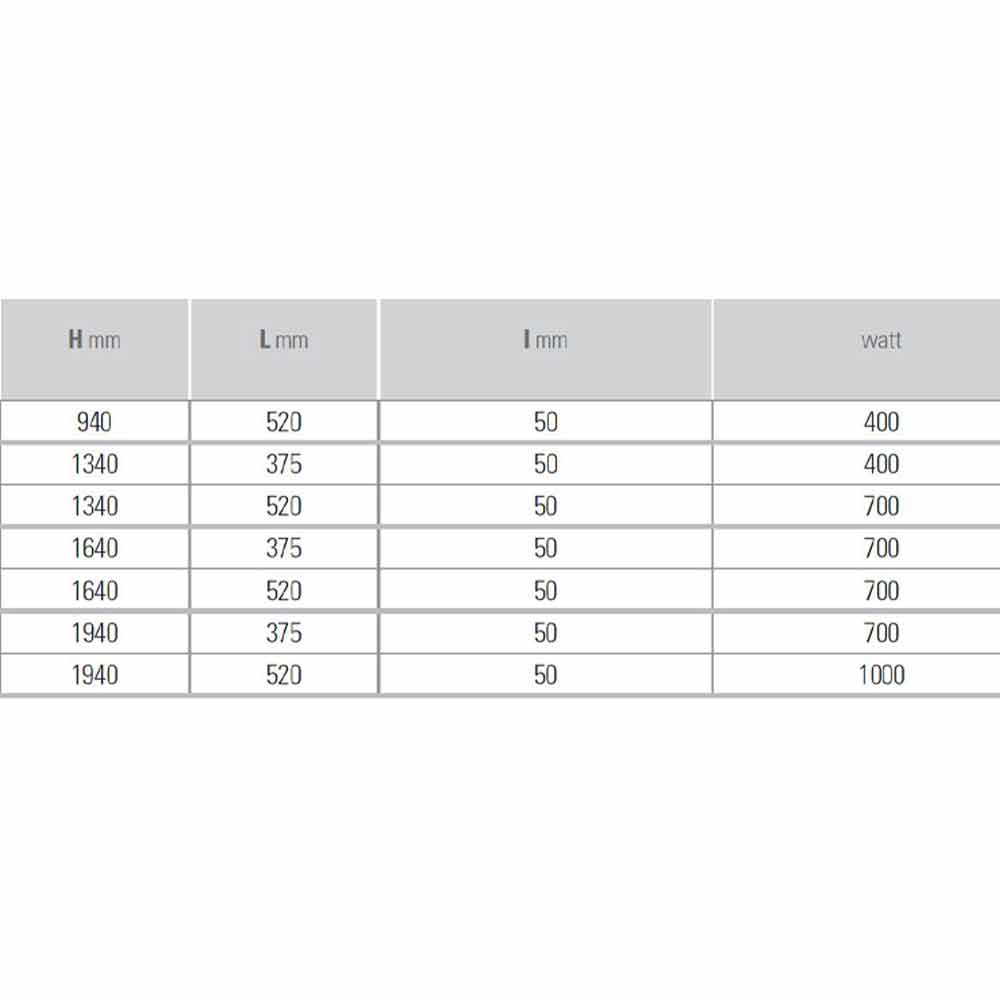 - H 1830 x L 375 x Inter. 50 x P 48 mm x Output w 700;