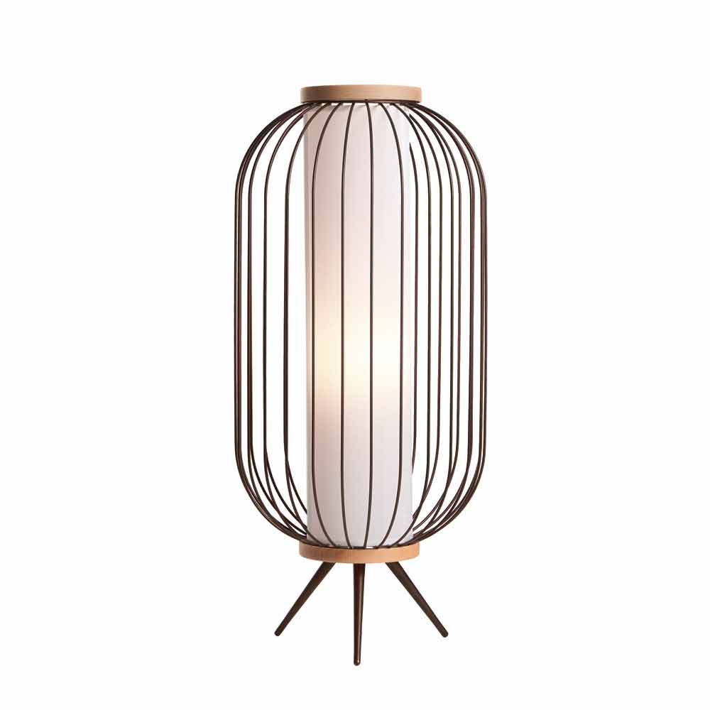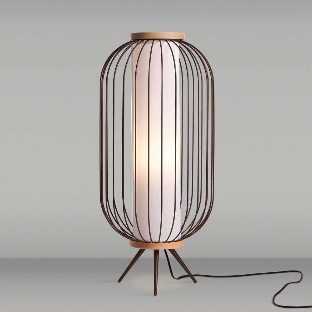 Floor lamp made of shaped steel bar and painted with epoxy powders. The two bands that close the rounded body are made of natural wood. The floor versions can also be used as empty pockets both in the lampshade version and without. The LED source of the version with handle is equipped with a rechargeable battery with an autonomy of about 6 hours.