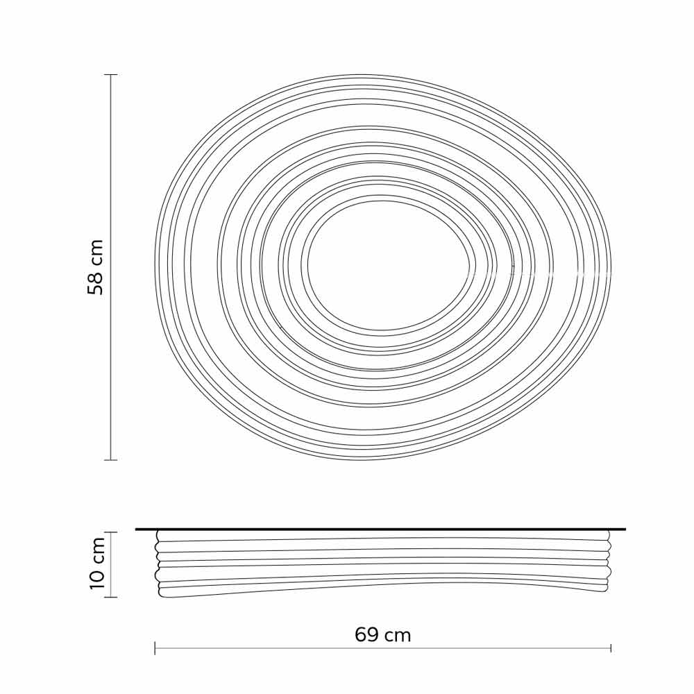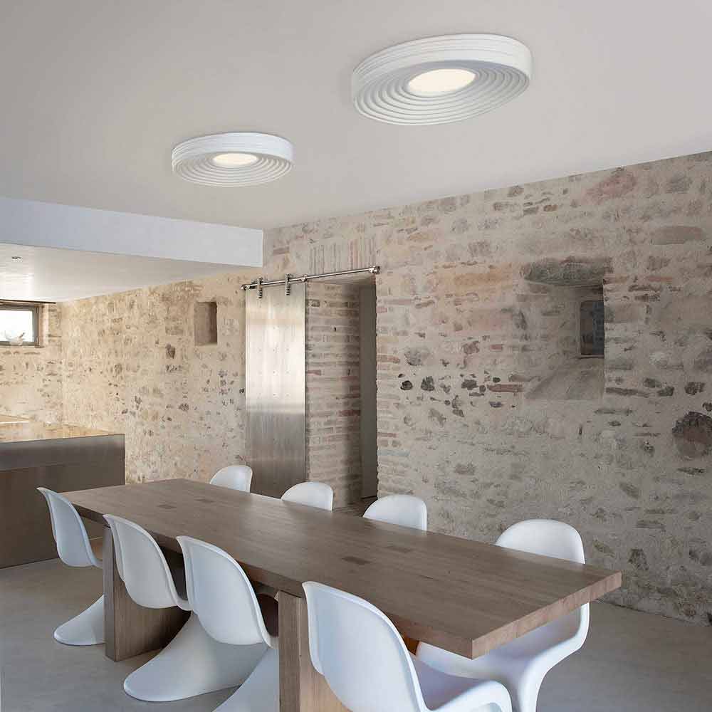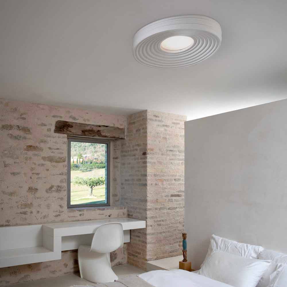 This original and singular ceiling lamp creates wonderful plays of light thanks to the central part that guarantees direct lighting and that propagates on the surface of the lamp, reflecting itself in concentric circles.