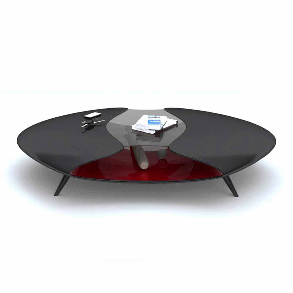 It has a rounded and stretched conformation along its transverse axis at the same time. Generated by elliptical geometries, highlighted not only by its shape, but also by the two access openings to the intermediate shelf with which it is equipped, also used to contain or store even large objects.