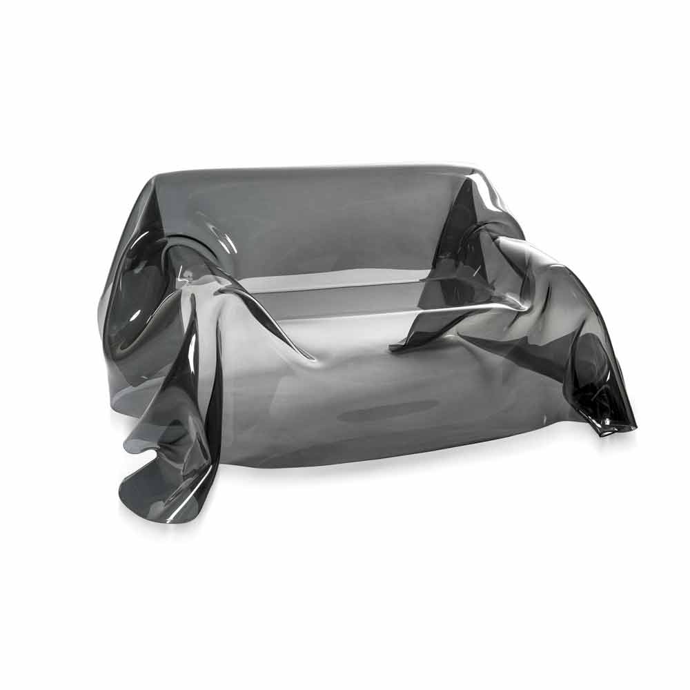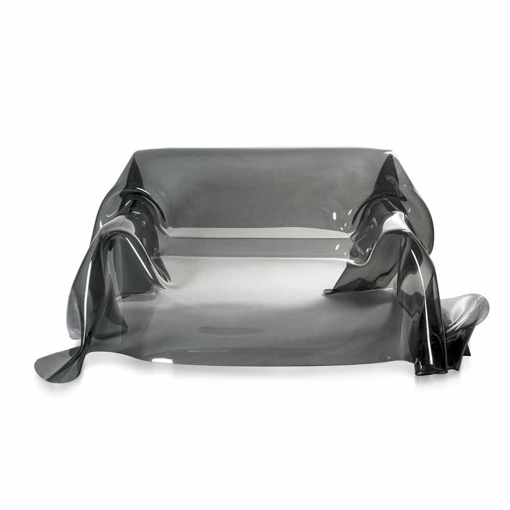 Each "Jolly" sofa is a unique modern art piece. From a 100% pure PMMA transparent smoke-grey colour plexiglass sheet, hand-draped, comes a unique canape. Self-supporting, the armchair can accommodate 2 seaters.