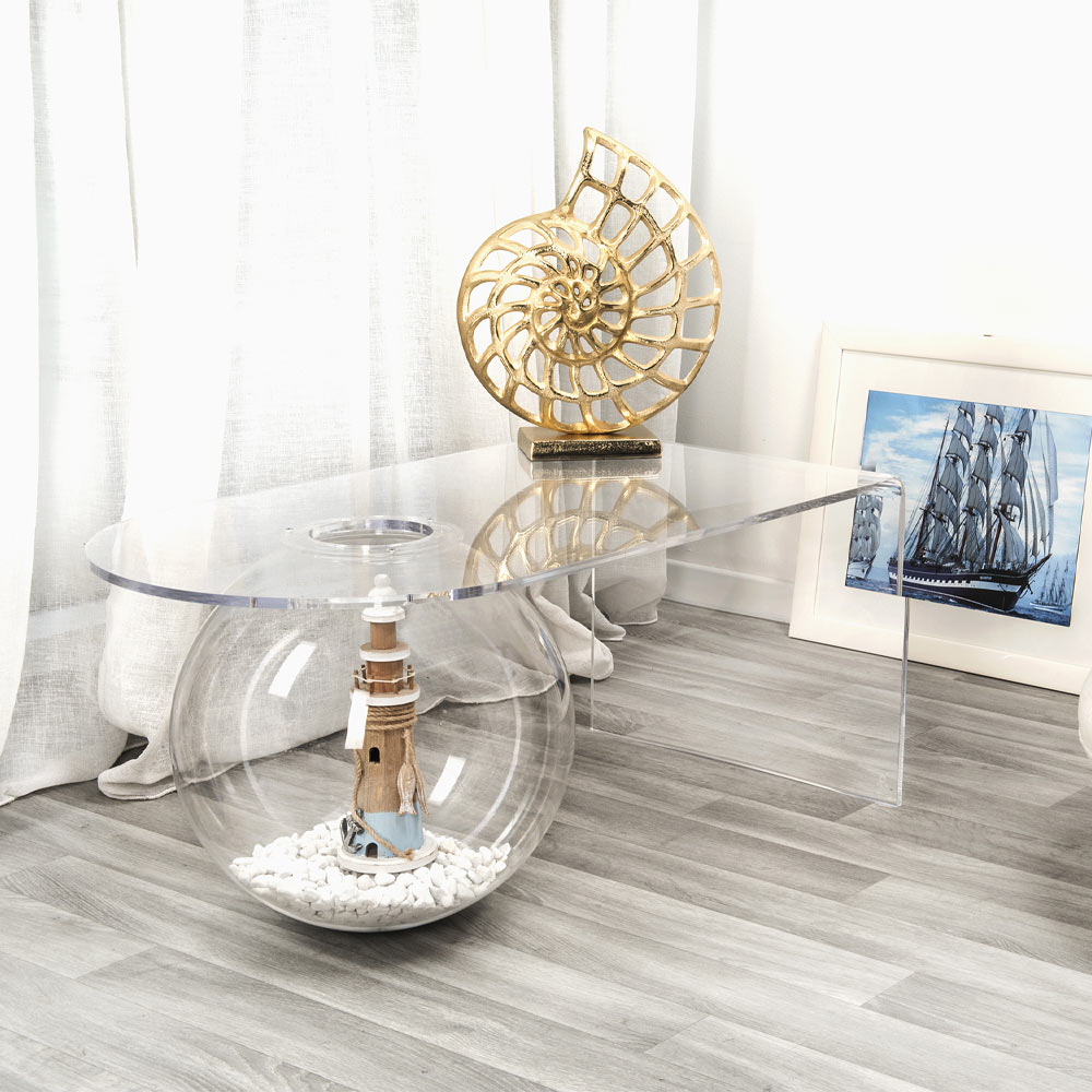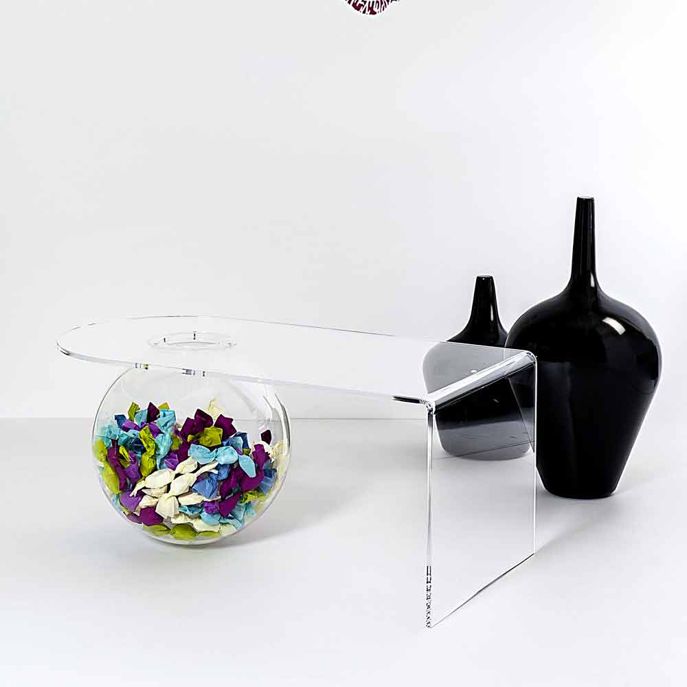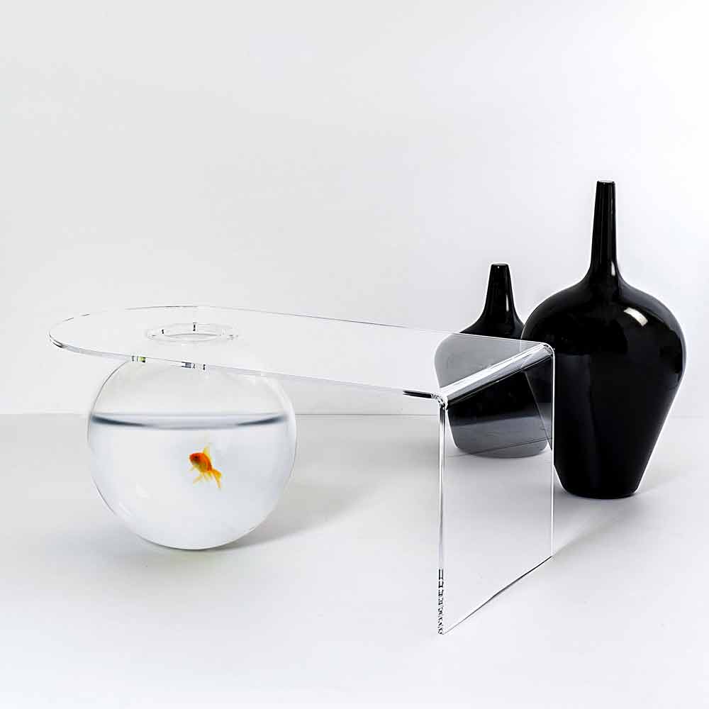 100% PMMA plexiglass from vergin polymers side table, laser cut, thermoformed and assembled to a polycarbonate sphere container that can be used as a flower pot or as an aquarium.