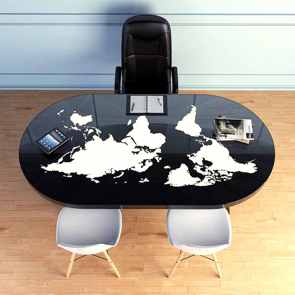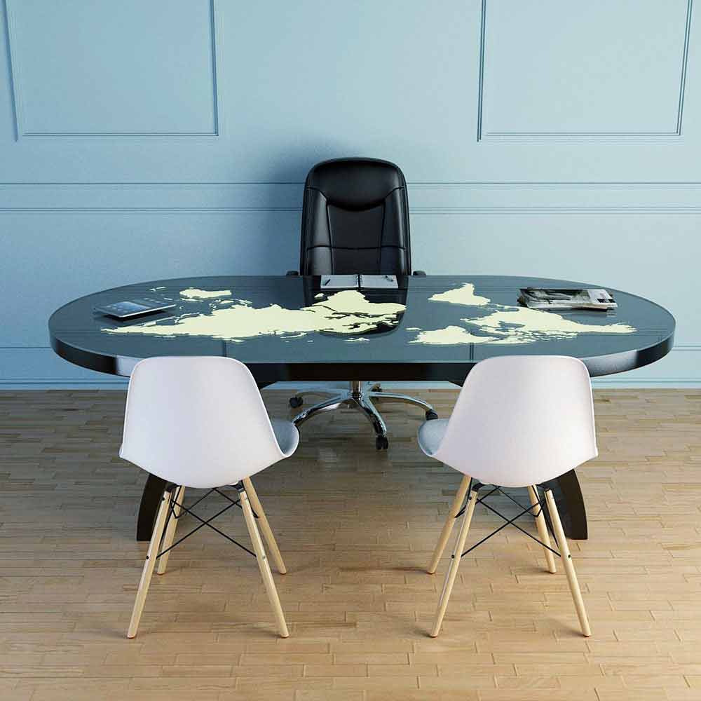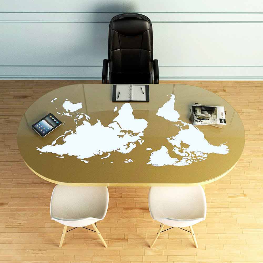 Pontida is a desk table with an ultramodern design; made of Solid Surface® and a glass top where the entire world is represented which, thanks to the presence of LEDs, lights up and changes color at your pleasure.