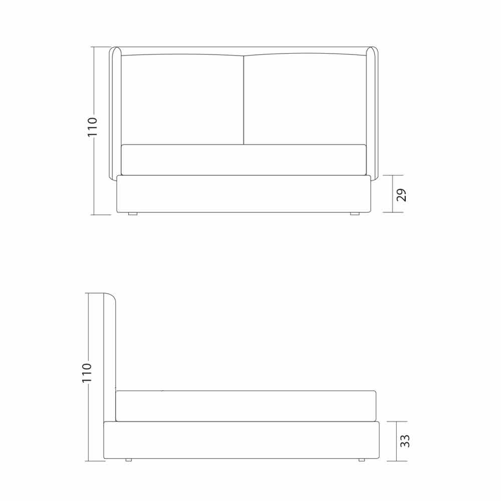 The structure is in fir wood blockboard with natural internal finish h.29 cm, covered in polyurethane foam without chlorofluorocarbons according to UNI standards and lined with light-stable velfodera. The bed is supplied with a slatted base with metal structure, curved frame with 50x37 mm profile painted with epoxy powders. Normal orthopedic slatted base, 15 slats in curved beech plywood 68x8 mm per bed. Vase feet H 4 cm.