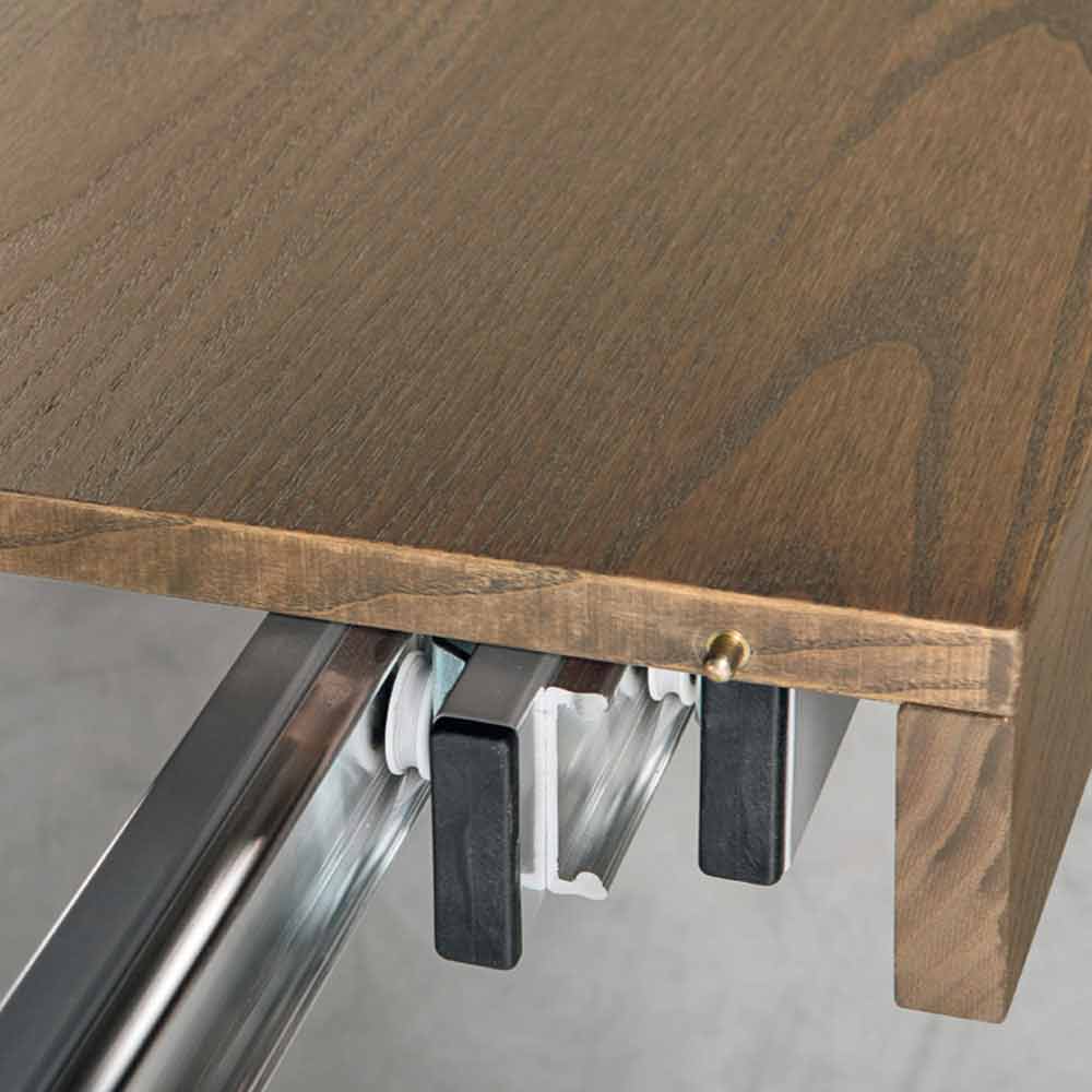 leg bridge in solid ash wood equipped with wheels with a lateral sliding painted metal frame; inside there are 3 extensions of 60 cm each.