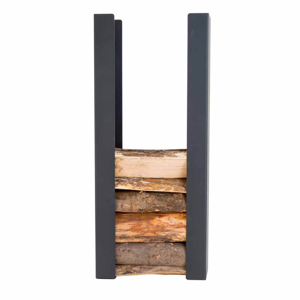 Firewood holder for fireplace made of high quality non-toxic powder coated steel.
