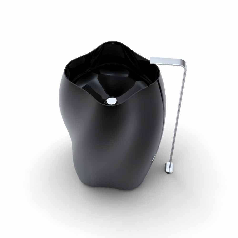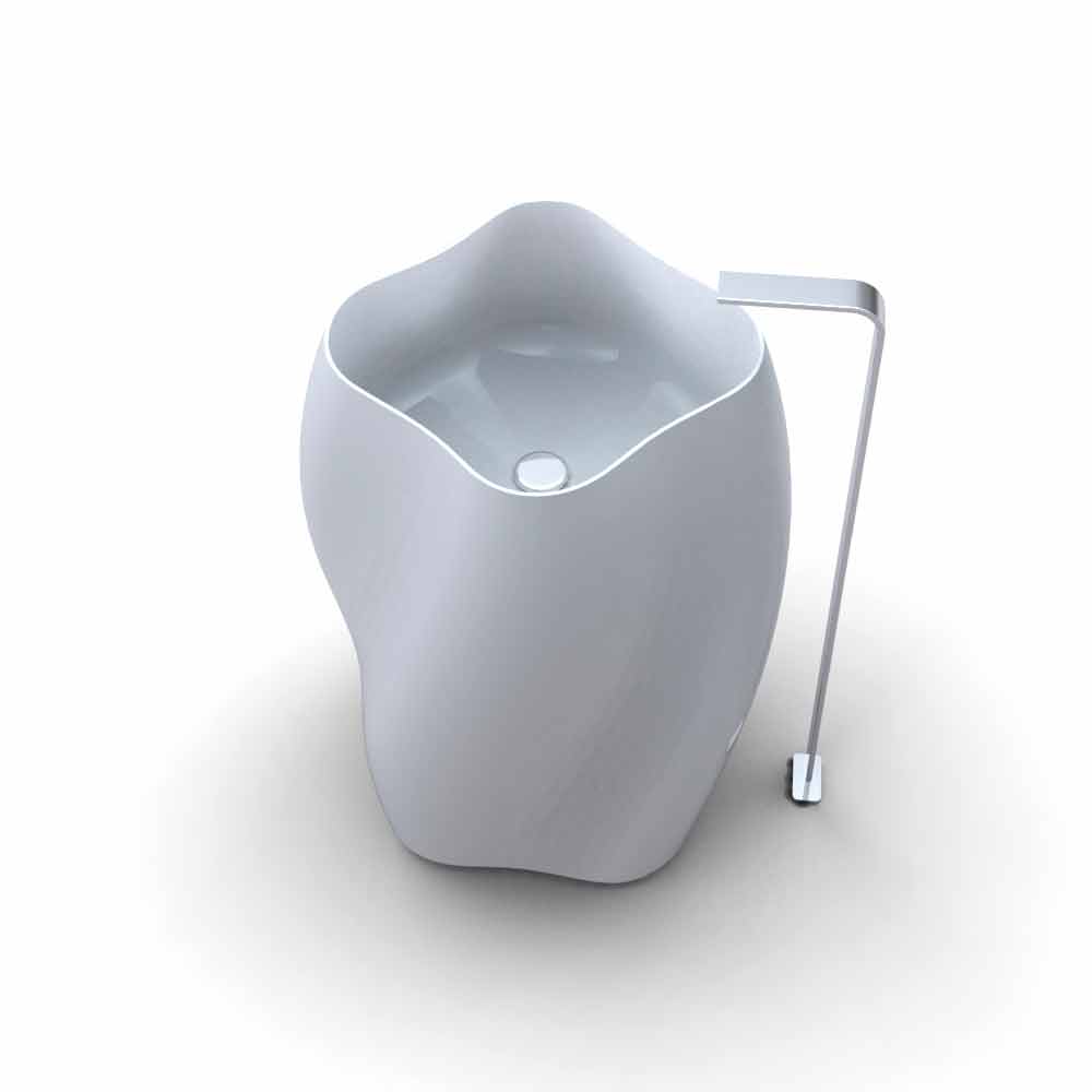 Free-standing washbasin with sinuous and organic shapes, in Solid Surface; Its lines show a profile that recalls the silhouette of an "exotic" flower. In addition to the “wavy” side profile, it has as its characteristics a slightly “twisted” shape on itself, slender towards the top to show a singular quadrilateral-shaped basin with lobes. The latter presents itself as a further element of characterization and a basic geometric figure, generating the entire composition. The sanitary ware also has good ergonomics, as it is quite rounded, available in two different color variants: White (RAL9003) or Black (RAL9005).
