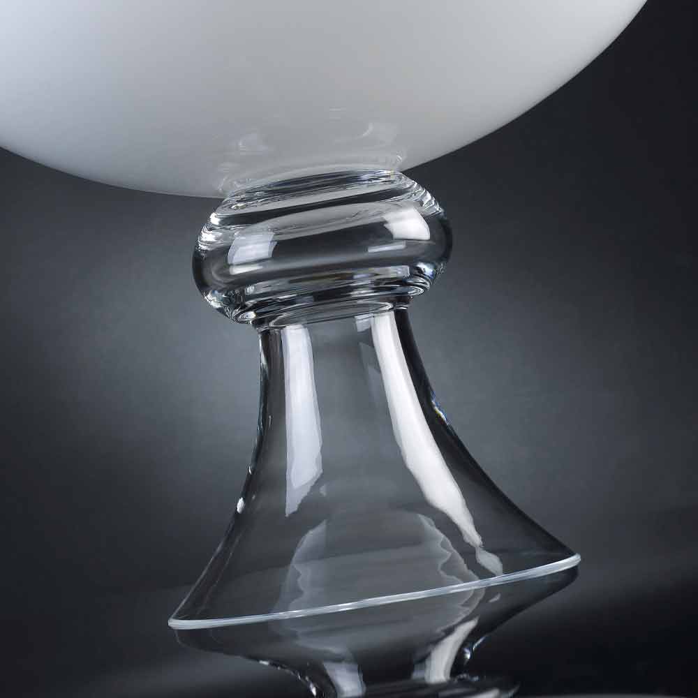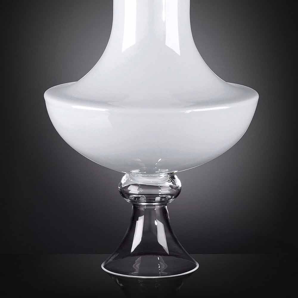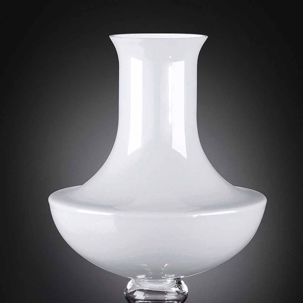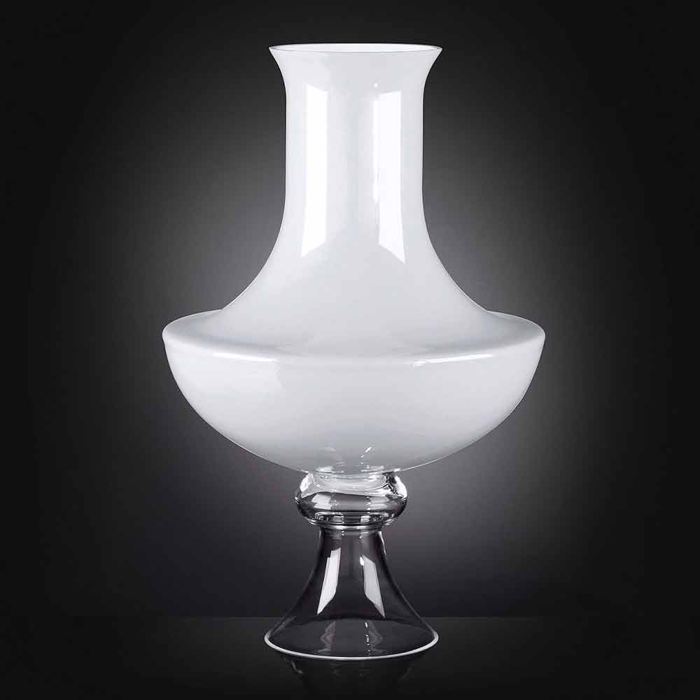 Modern vase for interiors in white glass with transparent base made through a 100% Made in Italy process . A complement characterized by a simple and clean aesthetic and a figure outlined by soft shapes and sinuous lines that allow it to be used in any environment with a refined style thanks also to the timeless elegance of glass, a quality material of high value. . An ideal design for the most varied environments, from home furnishings to that of hotels, restaurants, contract areas, spas but also as a setting for events and weddings.