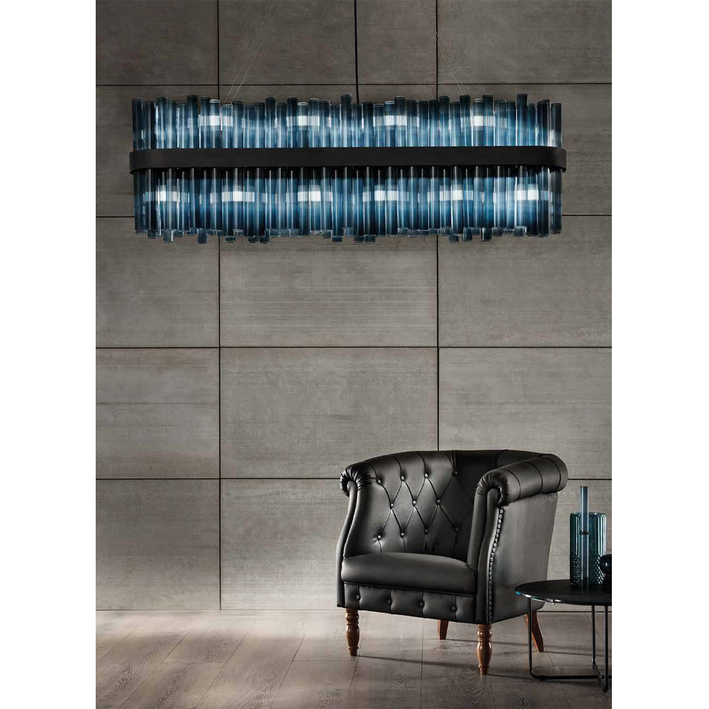 The chandelier with a modern and refined rectangular design is a luxury lighting accessory entirely handmade in Italy in blown striped glass and metal structure produced and painted by hand.