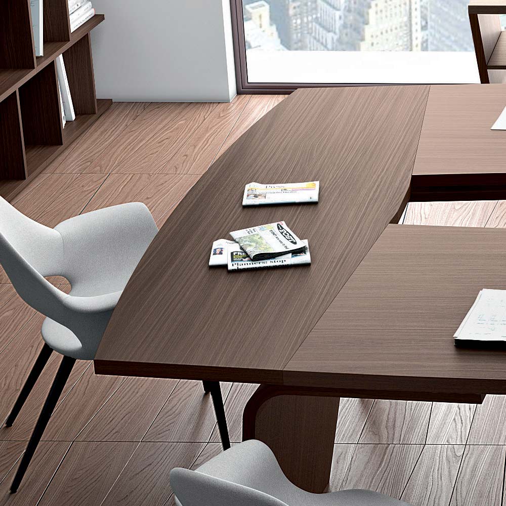 The top consists of two shaped tops and two extensions which close the perimeter of the top, creating an imposing and elegant meeting table.